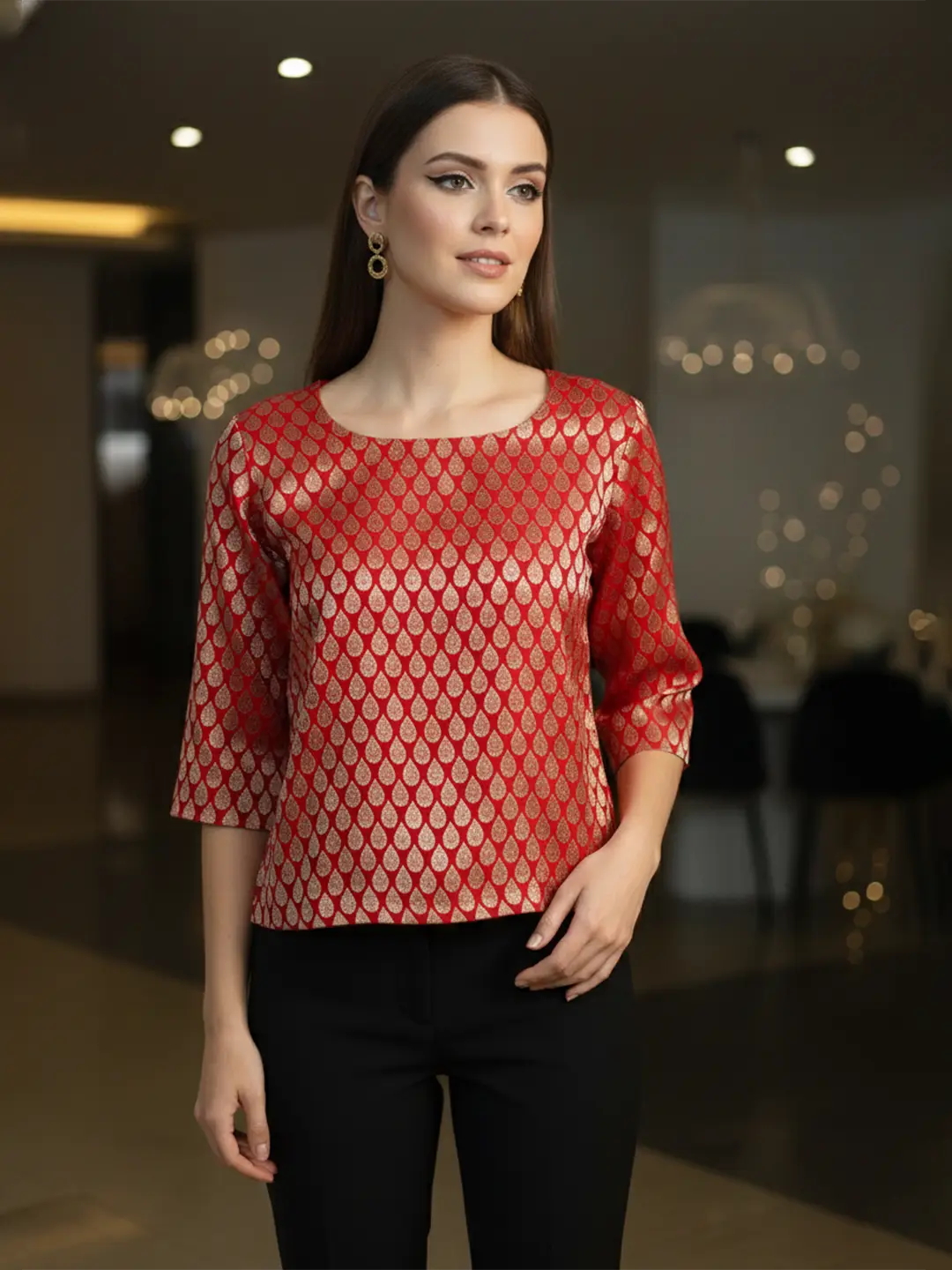 Red brocade party top