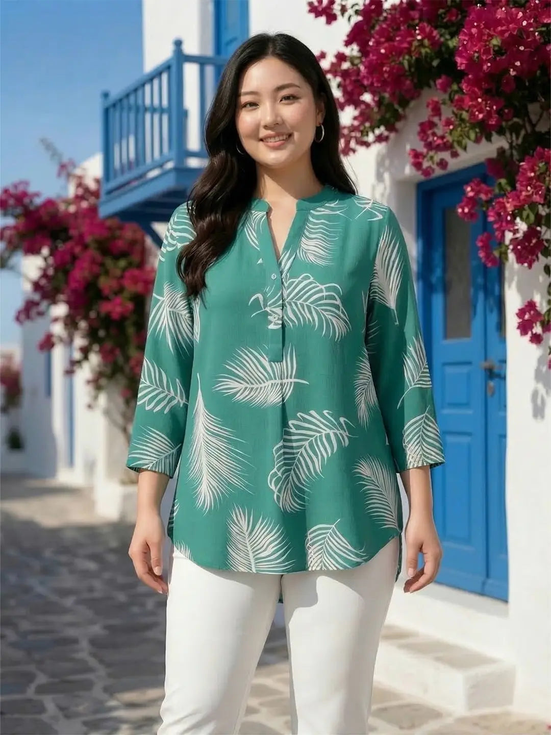 Mandarin collar half placket printed cotton shirt