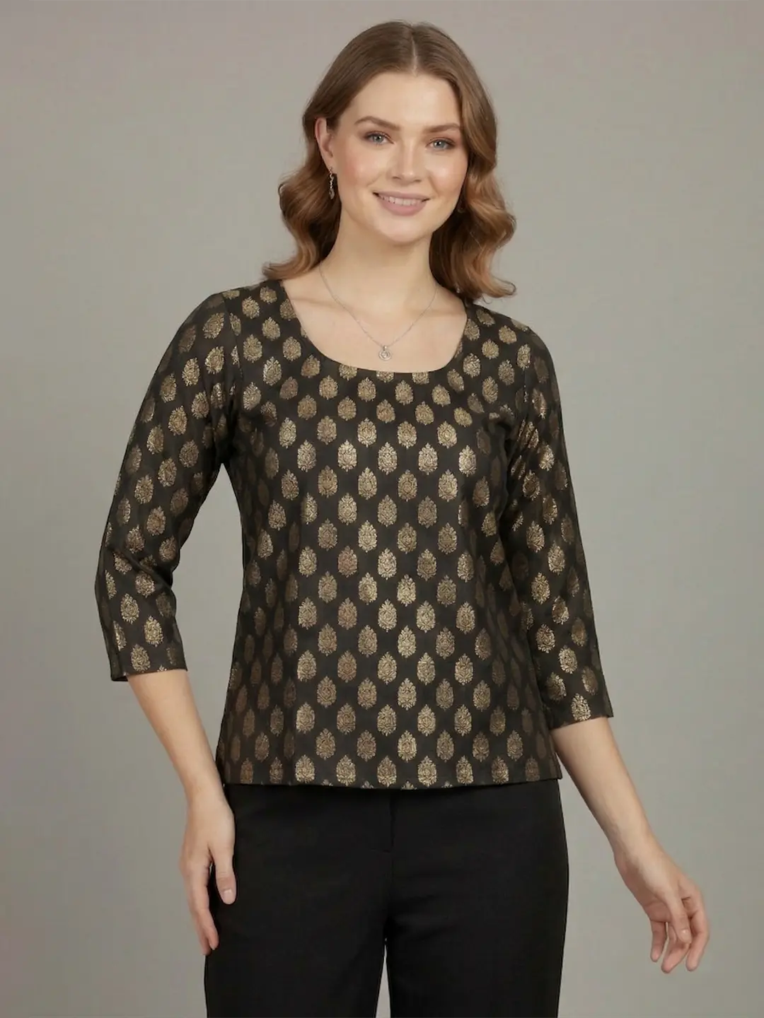 Black Brocade Regular Fit Top with Straight Hemline