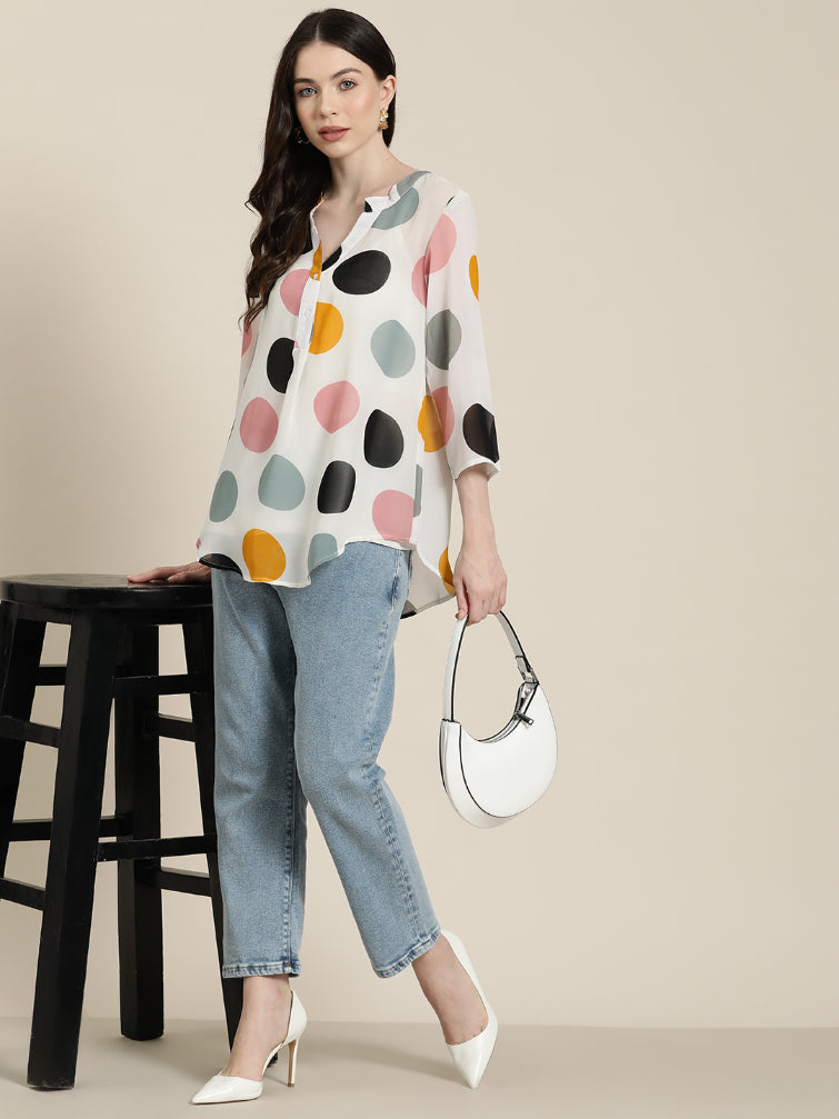 Multi colour big polka half placket shirt with 3/4 regular sleeves.