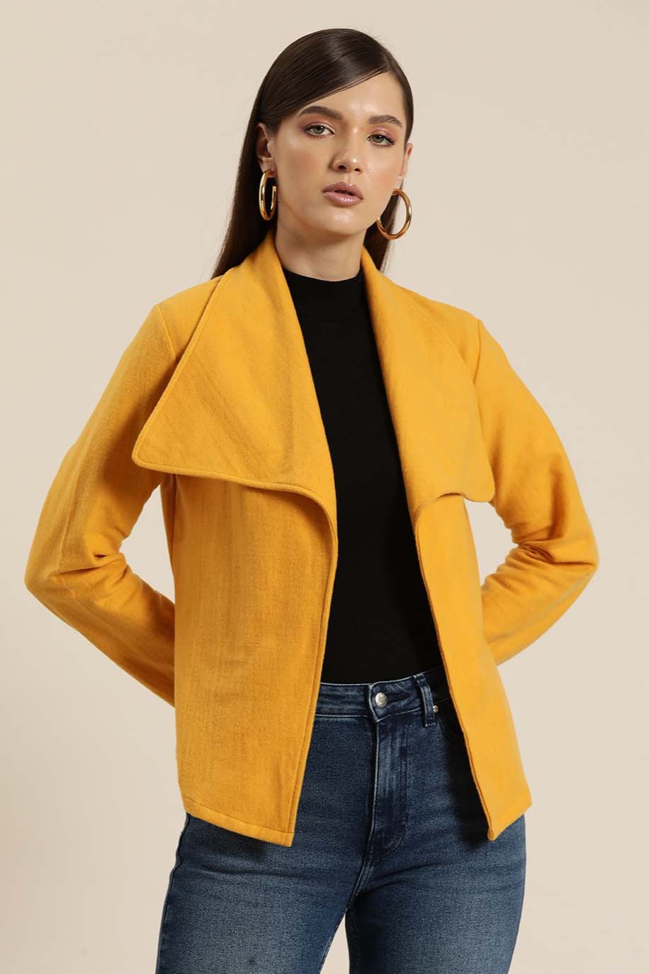 Bagatelle Drape Yellow Fleece Jacket Complete your contemporary look with an open-front short jacket
