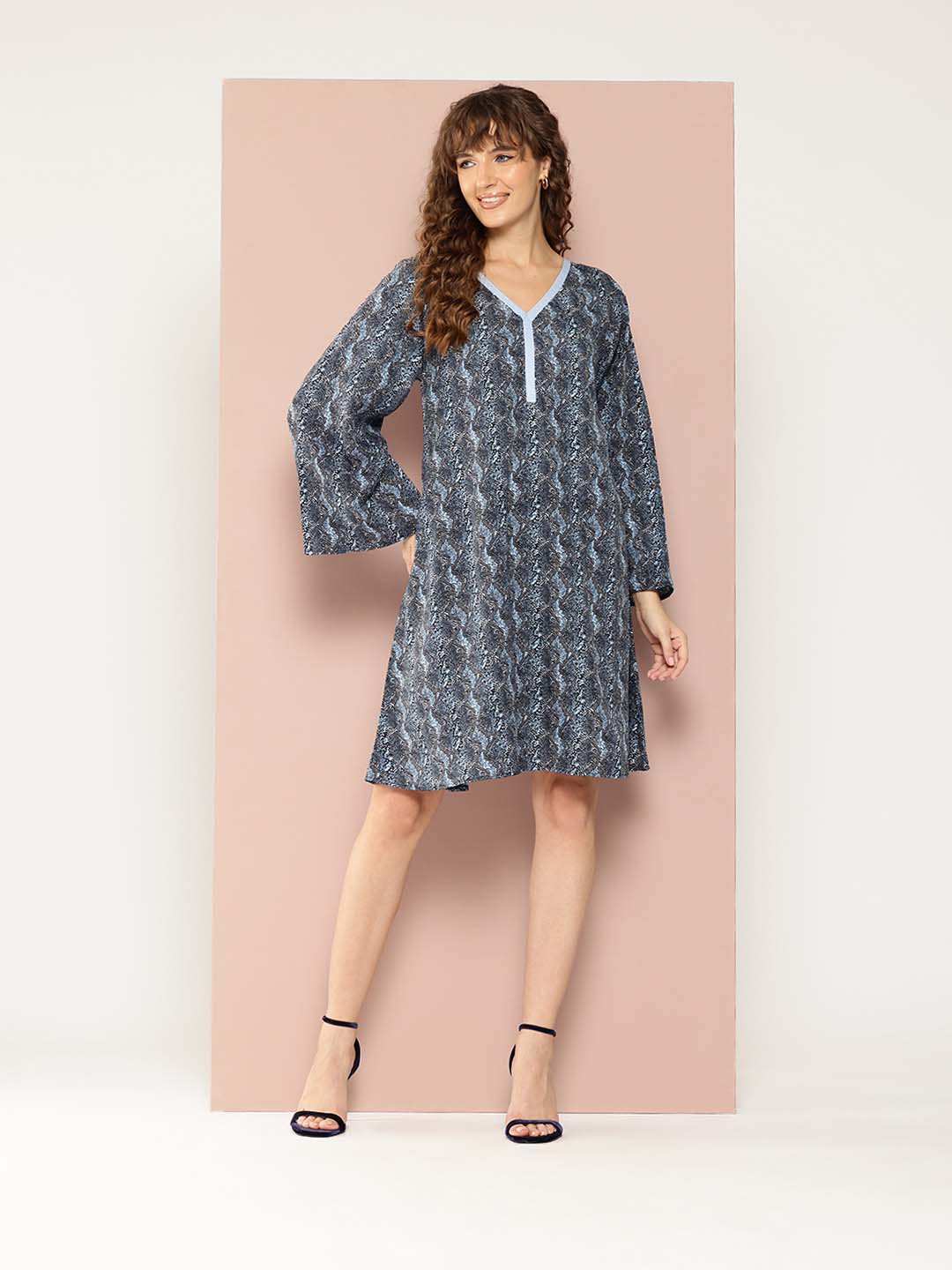 Black & powder blue Animal print A-line Dress With Bell Sleeves