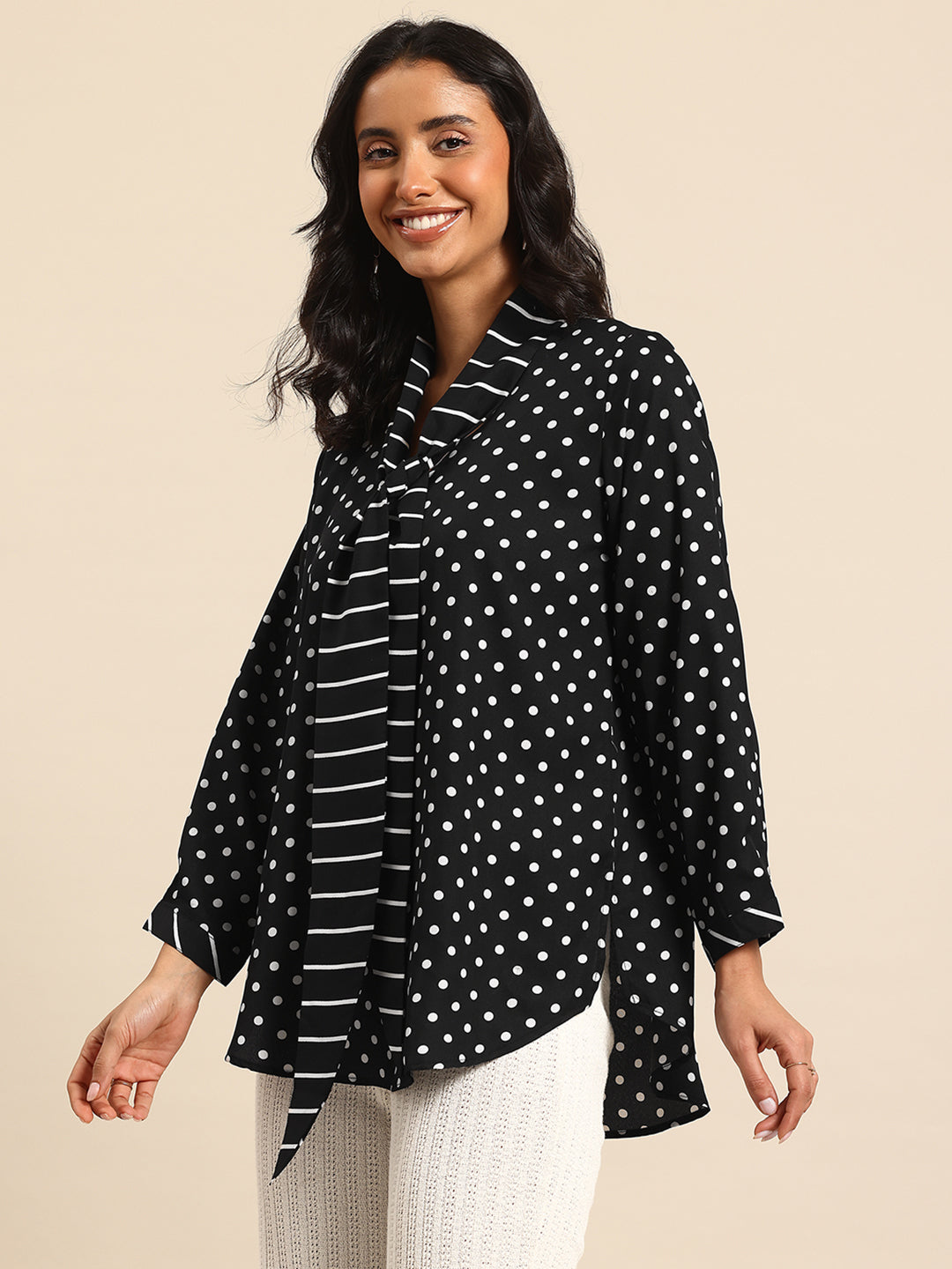 Black & white polka dot V-Neck stripe tie top with full cuff sleeves.