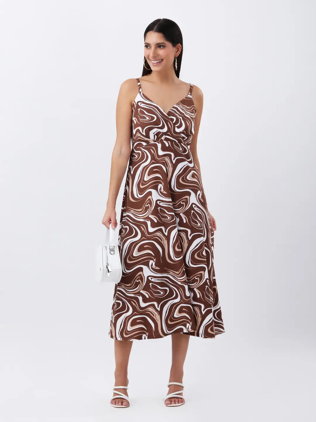 Animal Dark Brown Slim Fit V Neck Full Bloon Sleeves Crepe Dress