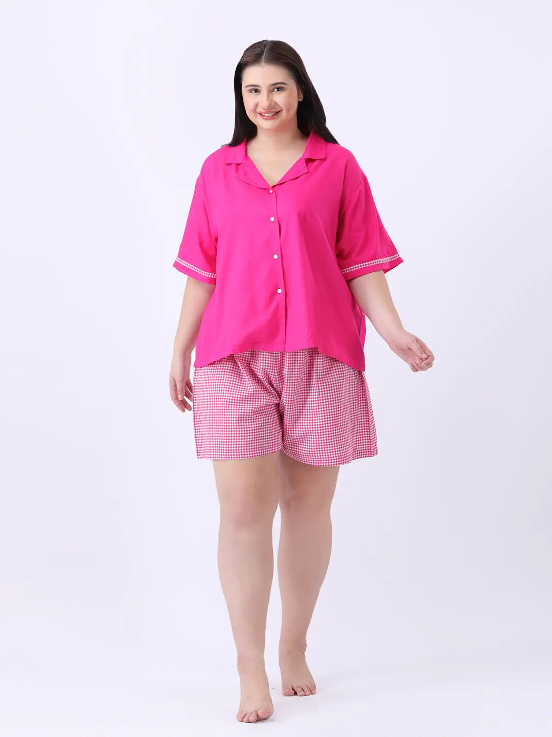 Magenta rayon notch collar shirt with gingham shorts co-ord set