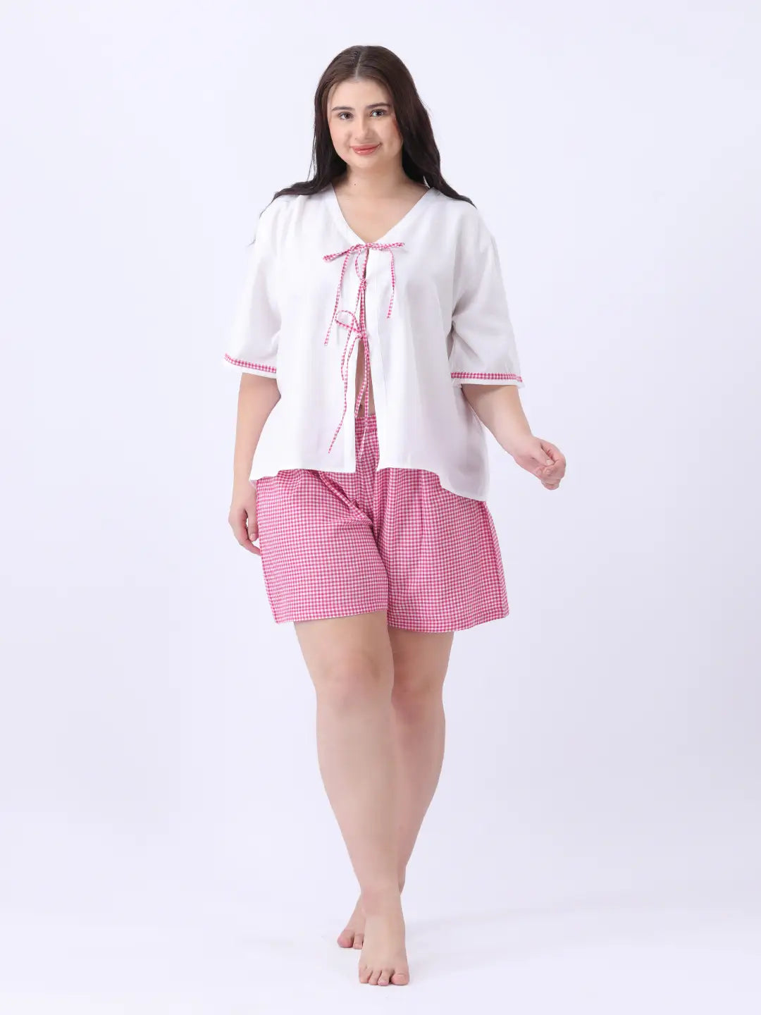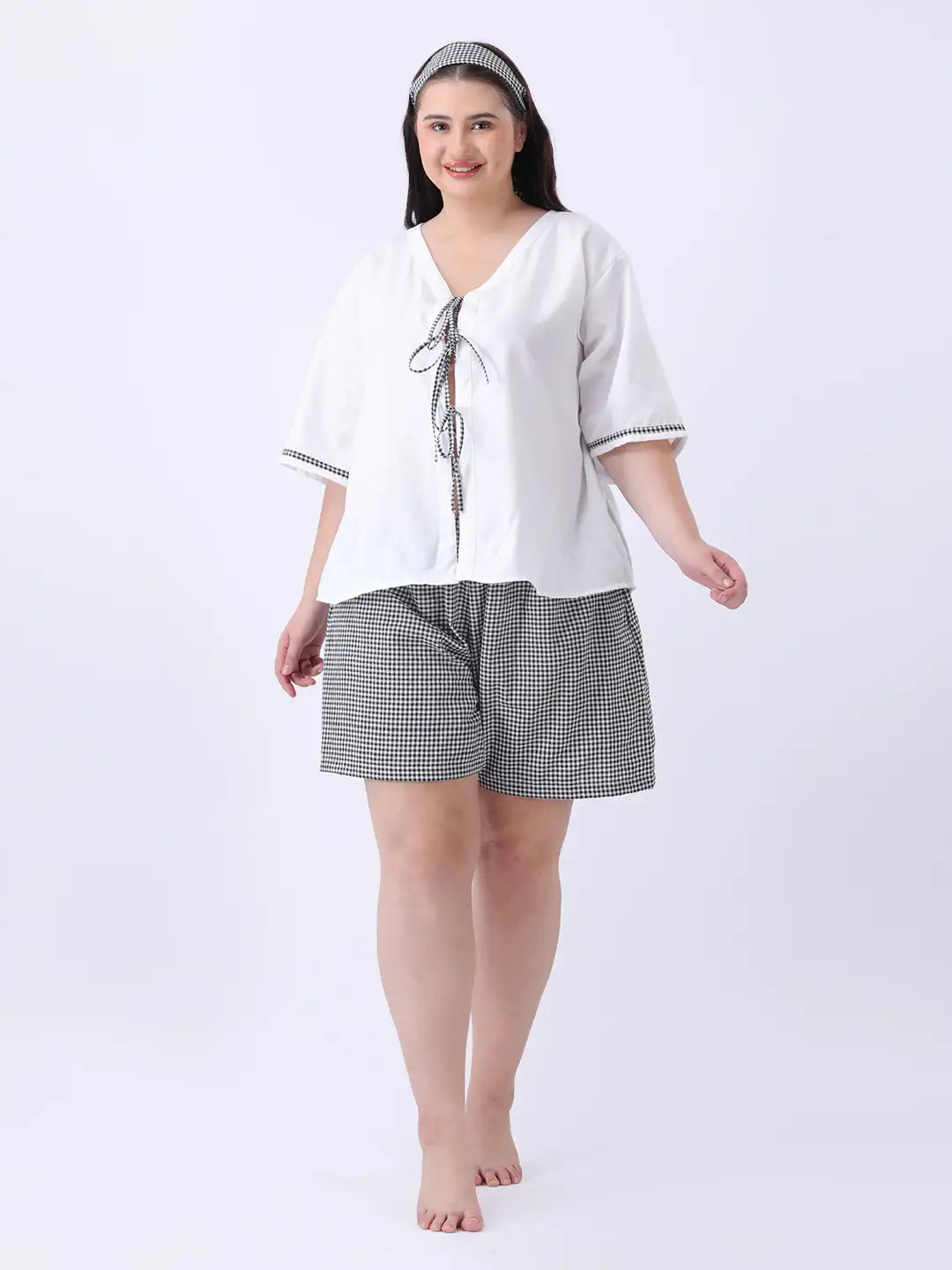 White rayon loose fit gingham bow top with gingham shorts co-ord set
