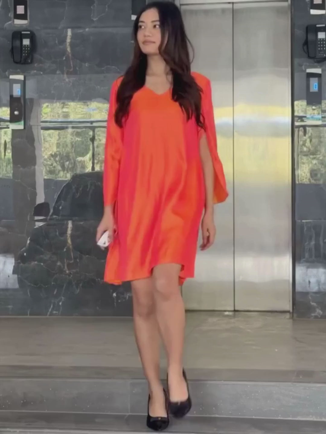 Solid Bright Orange Relaxed Fit V Neck Full Petal Silk Dress