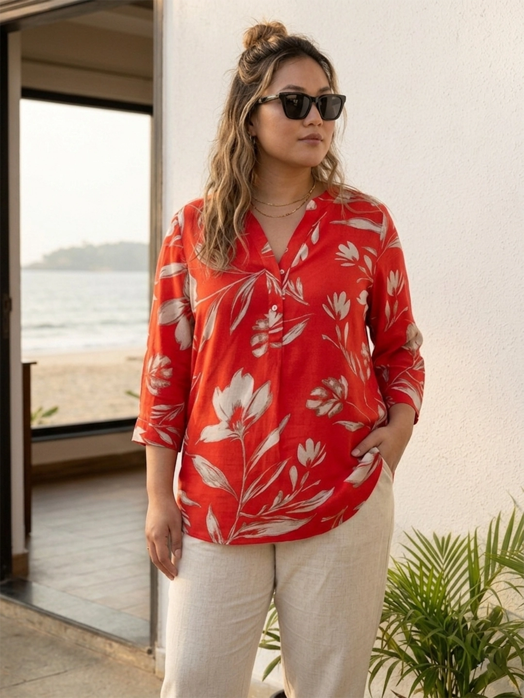 Red Rayon Loose Fit Shirt with Curved Hemline