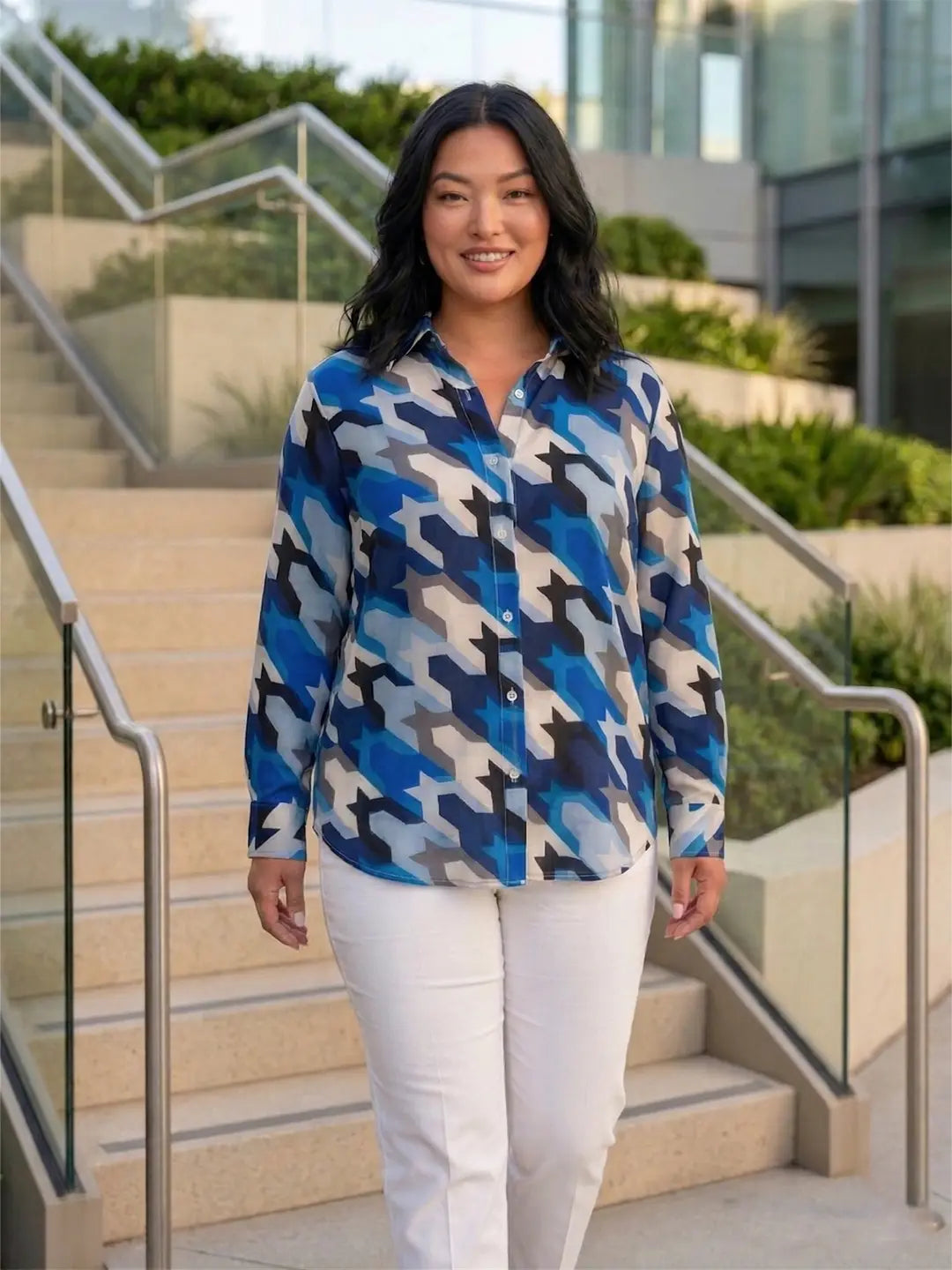 Blue printed crepe shirt with cuff sleeves