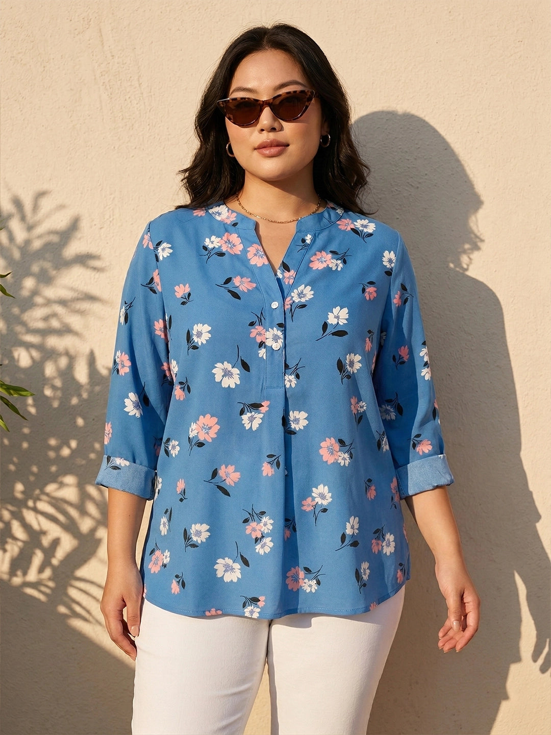 Mandarin collar floral print shirt