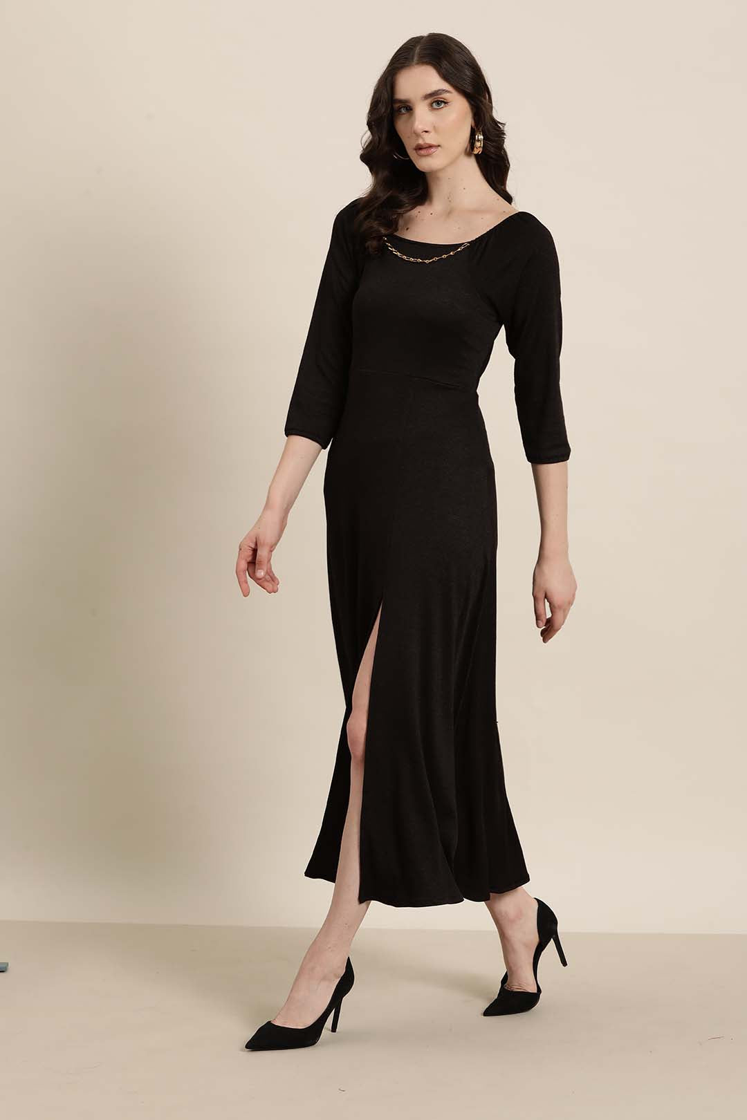 Black solid long party dress with square neck embelished with gold chain. One thigh slit...