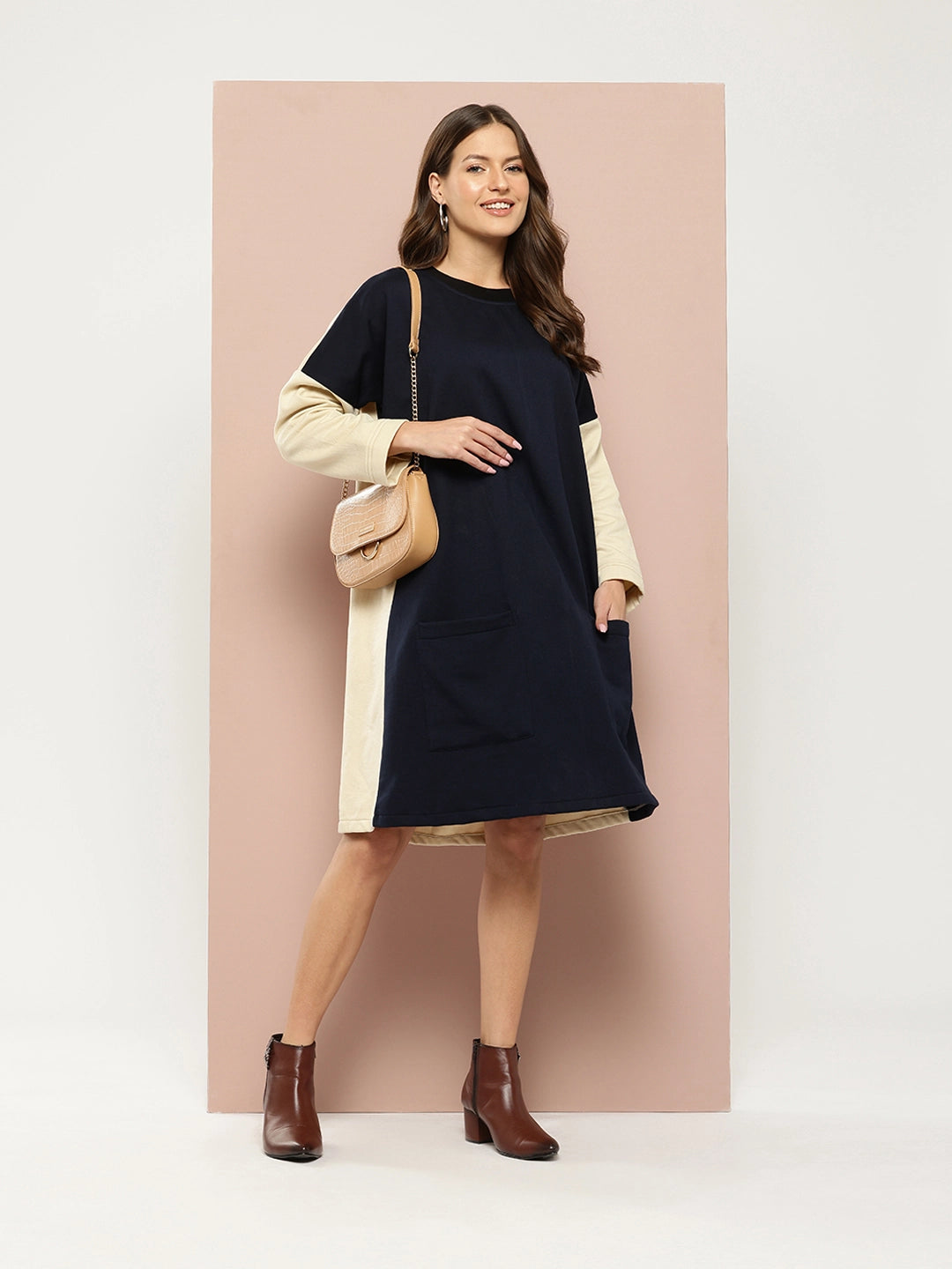 This chic color-block winter blue midi dress features full sleeves and front pockets, combining comfort...