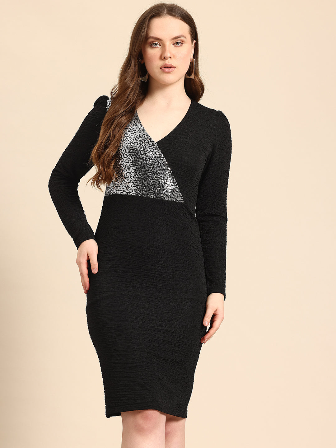 Bodycon dress with silver sequin shoulder patch embellishment.