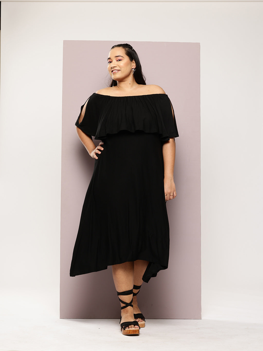 Solid Dark Black Regular Fit Off Shoulder Elbow Length Jersey Dress