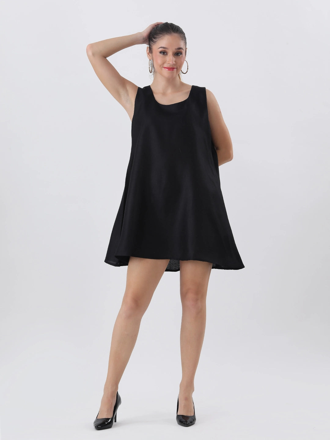 Black Cotton Slub Regular Fit Dress with Curved Hemline