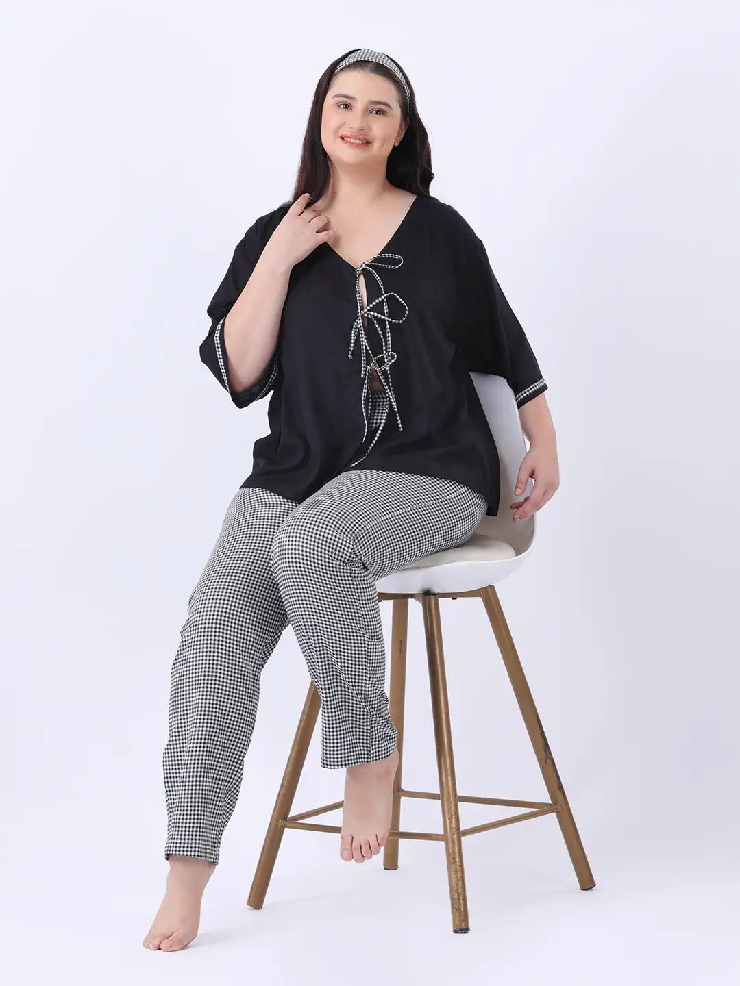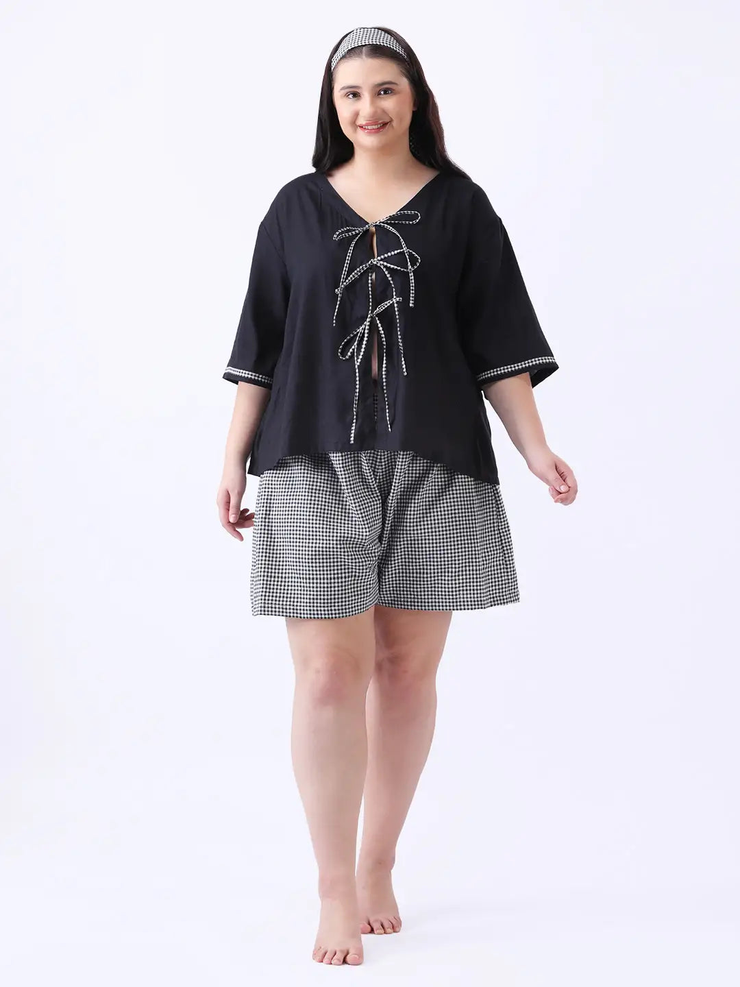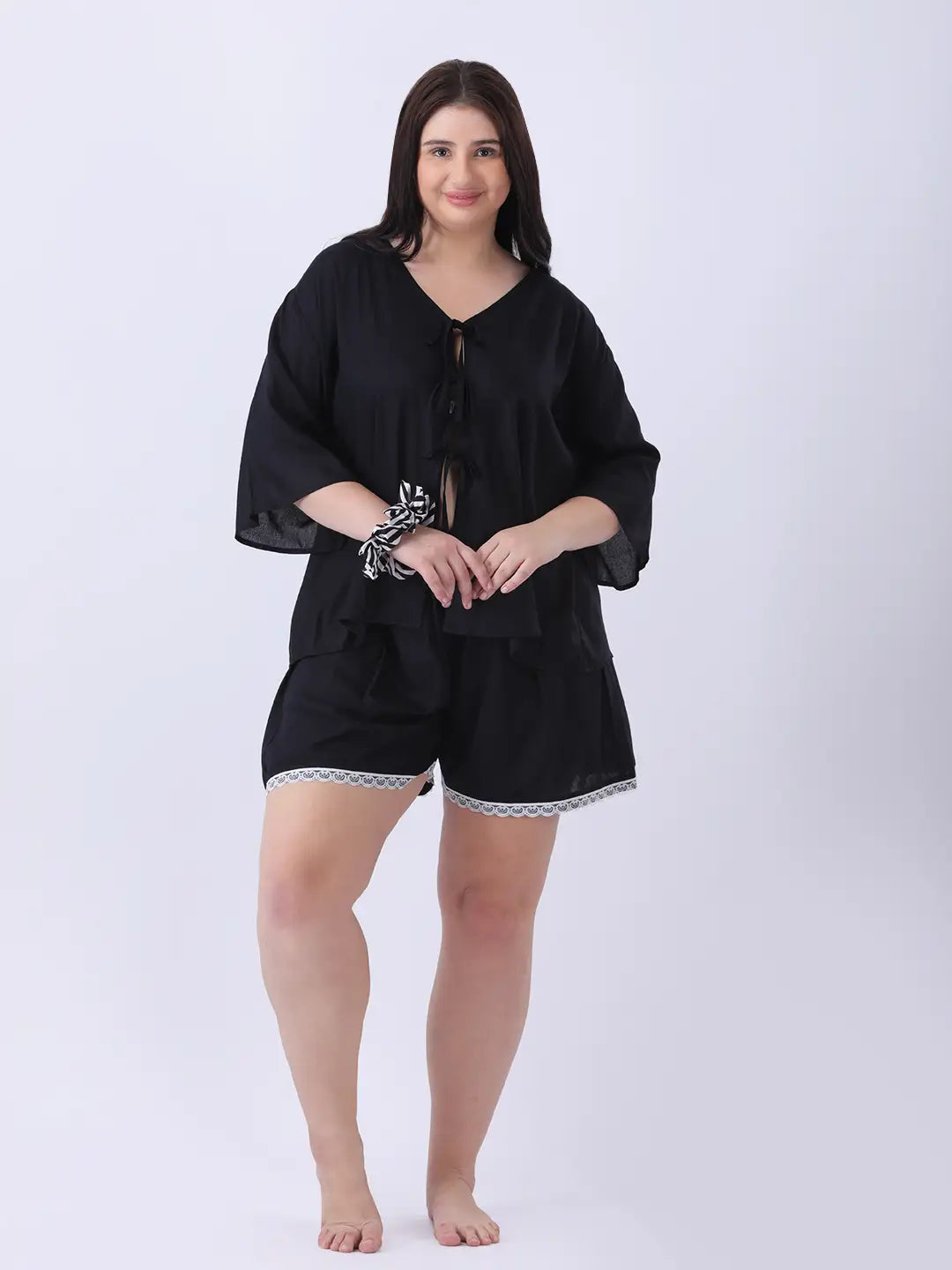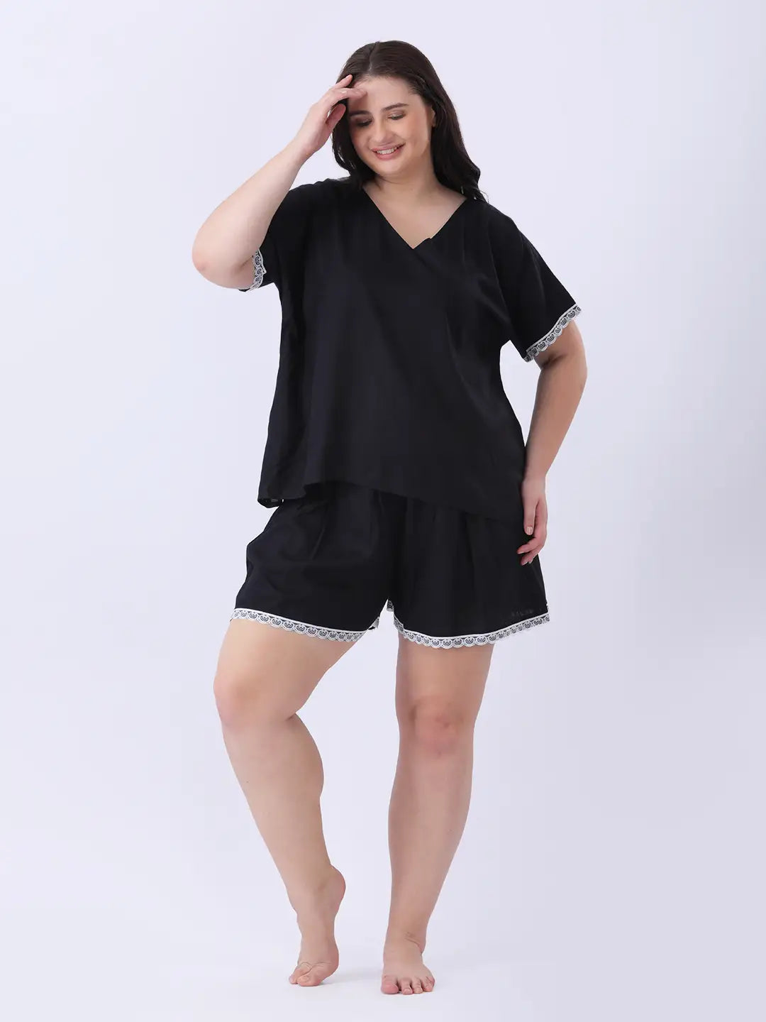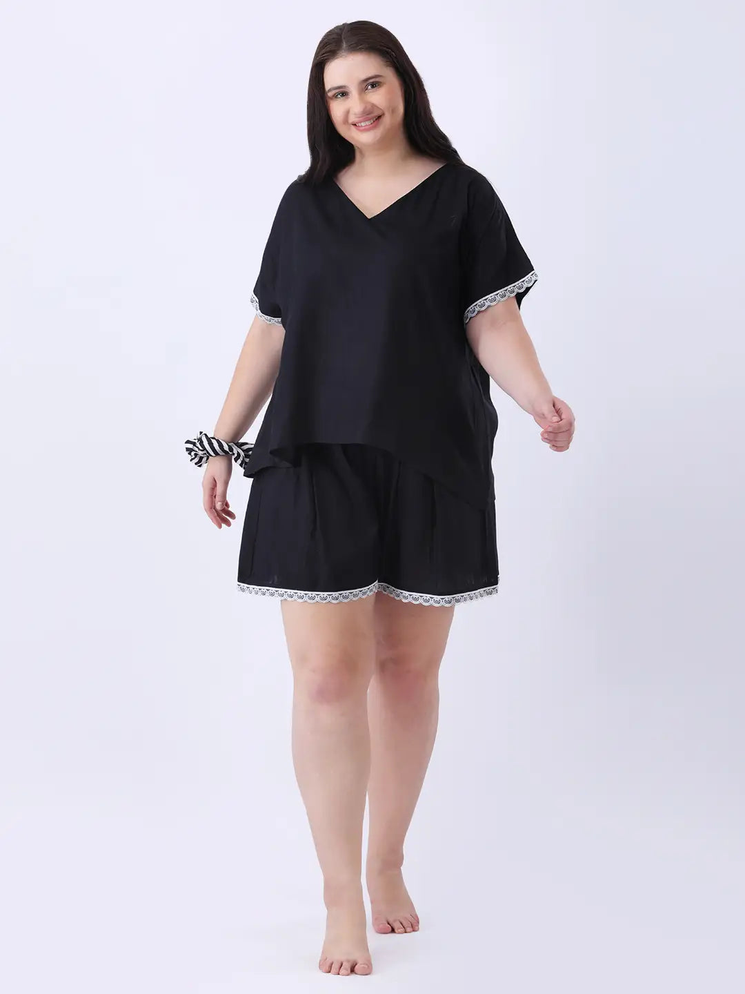 Black rayon v-neck drop shoulder top with shorts co-ord set