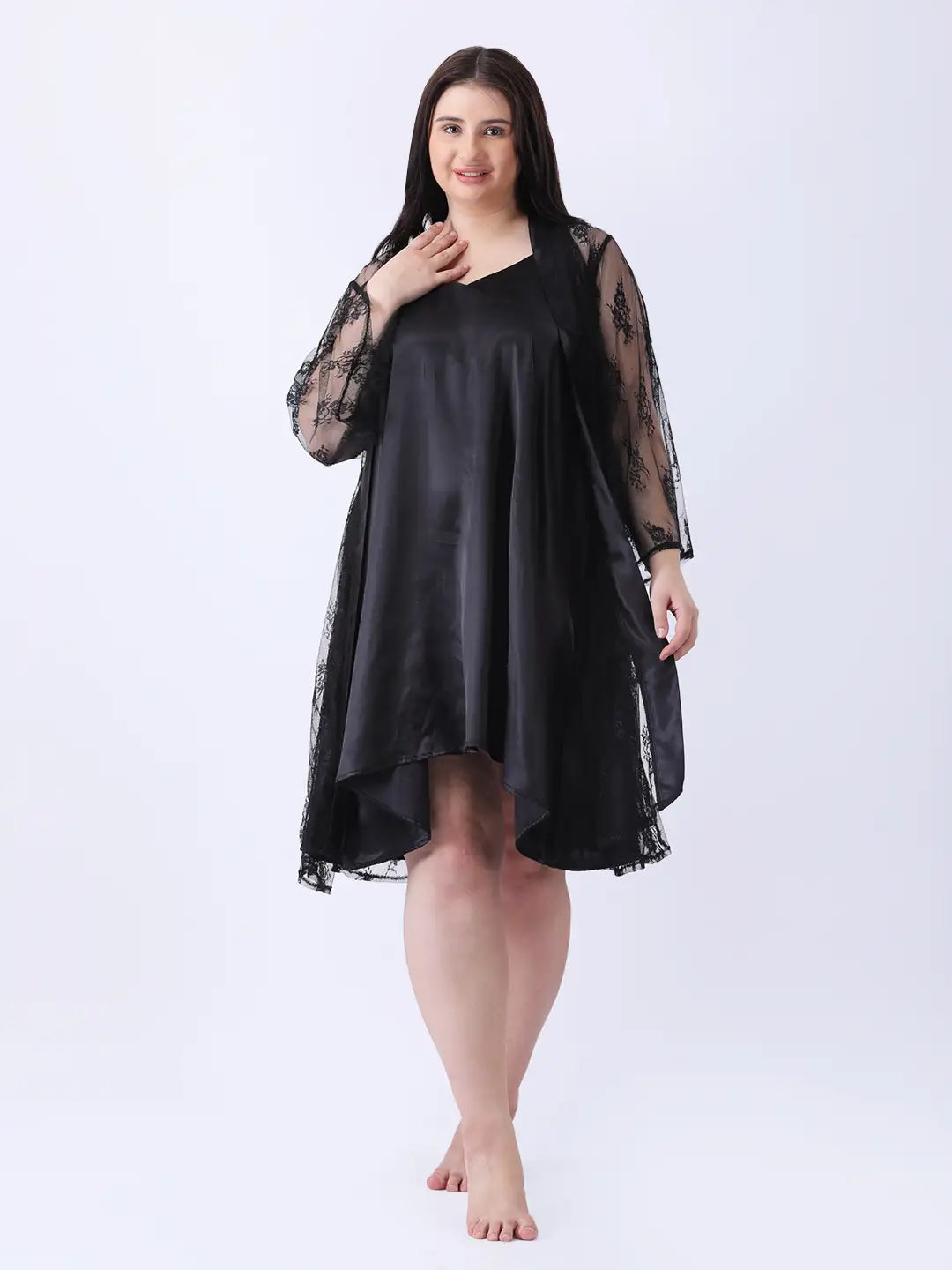 Black Crepe Loose Fit Shirt Dress with Curved Hemline