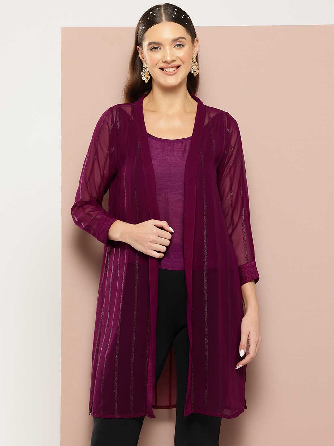 Burgundy Silver lurex stripes georette party shrug with open front .