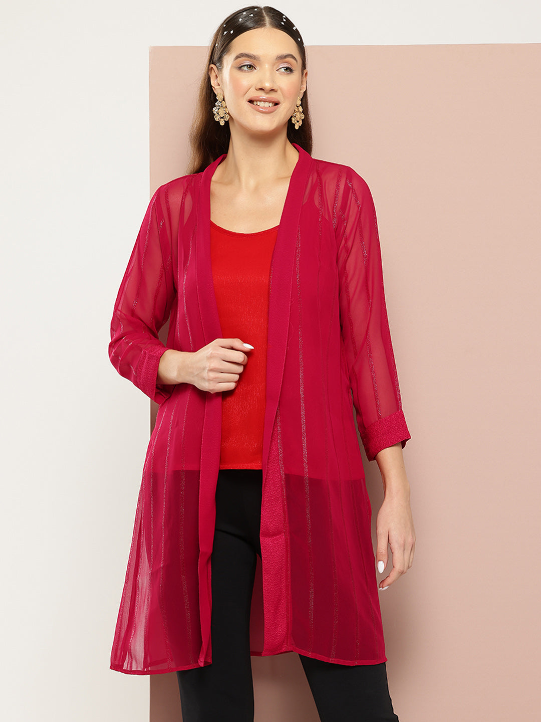 Solid Red shrug with subtle silver lurex stripes, bordered details, full sleeves, and side high...