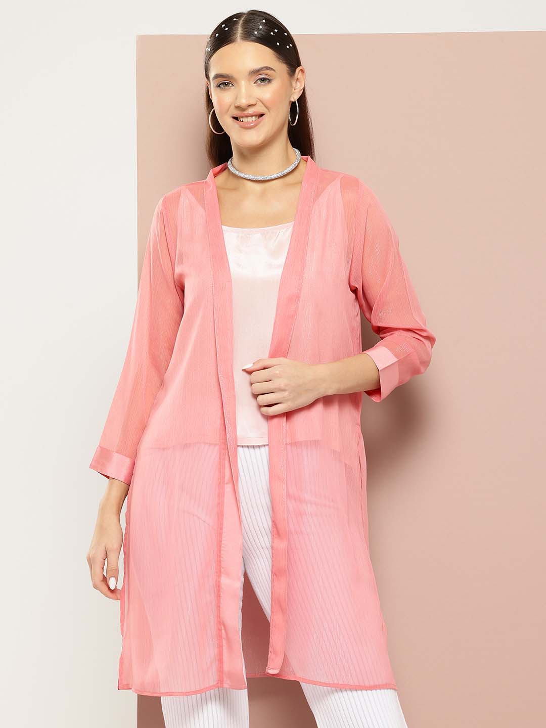 Pink shimmery georette embelished party shrug with open front .