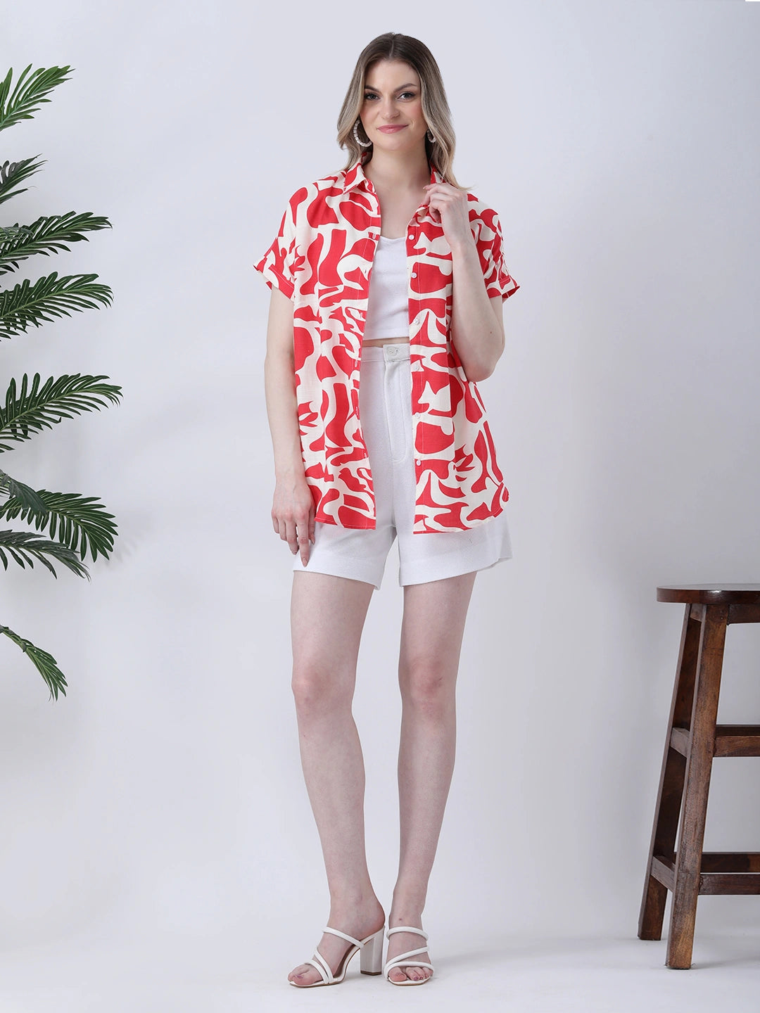 Red Rayon Loose Fit Shirt with Curved Hemline