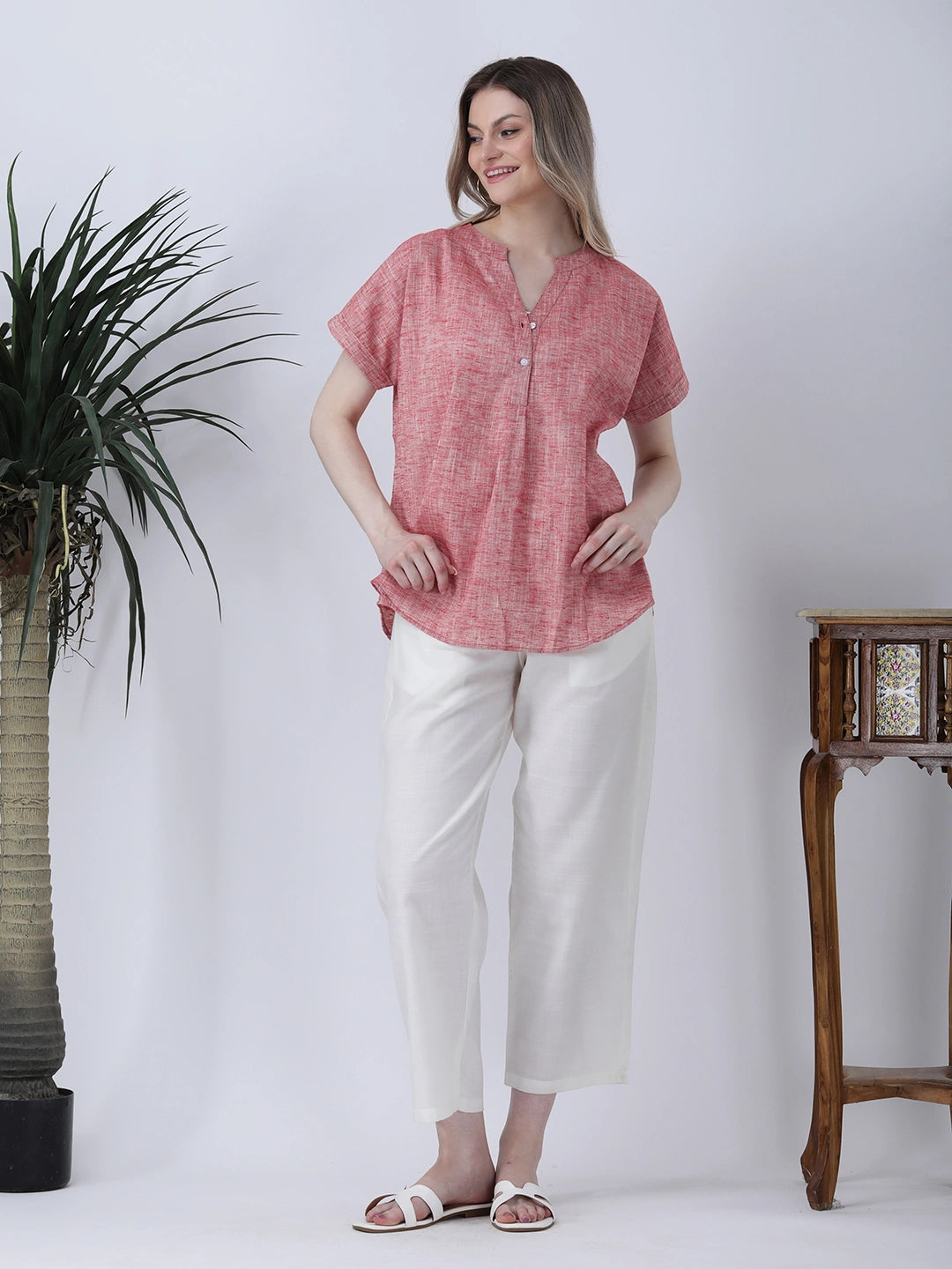 Red drop shoulder half placket linen shirt