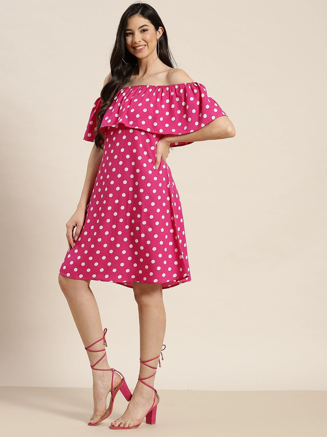 Hot Pink Polka Dott Off Shoulder Dress Ruffle Midi Dress