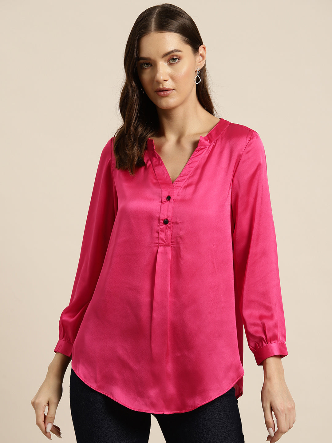 Hot pink half placket mandarin collar satin shirt with full cuff sleeves