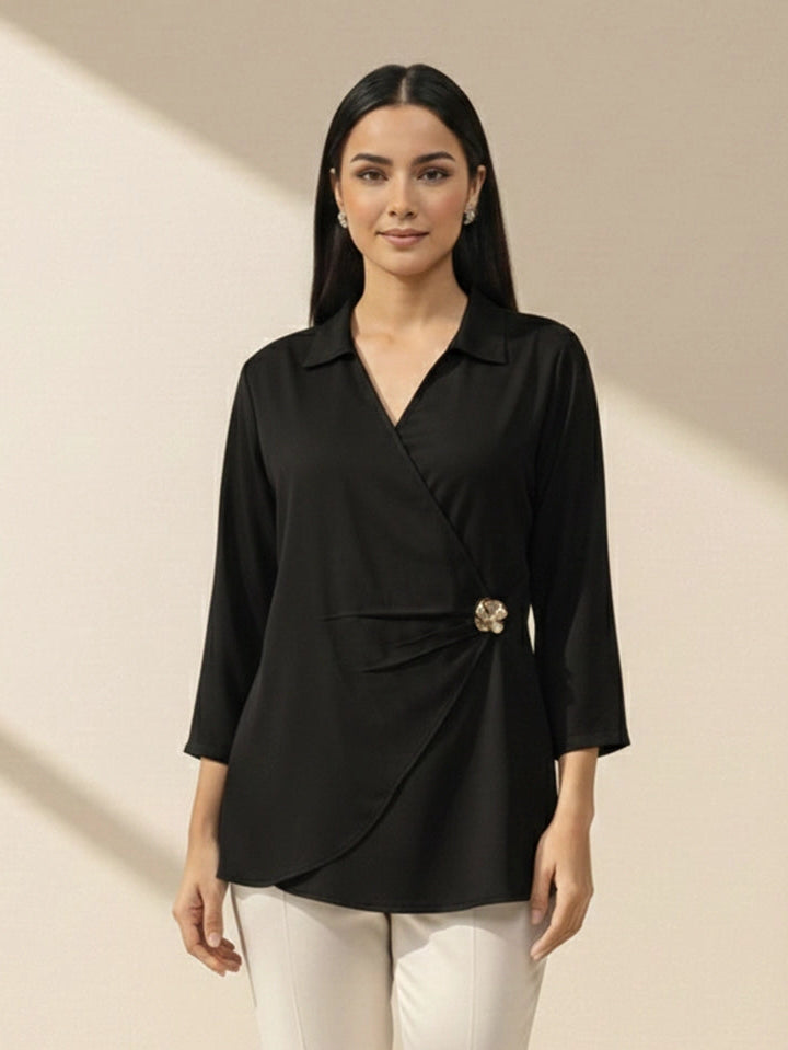 Solid Dark Black Regular Fit V Neck Three Quarter Silk Top
