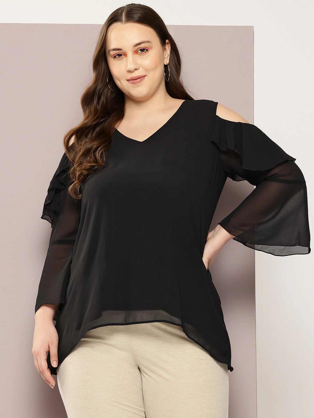 Black solid cold shoulder ruffle top with bell sleeves is a chic and versatile garment