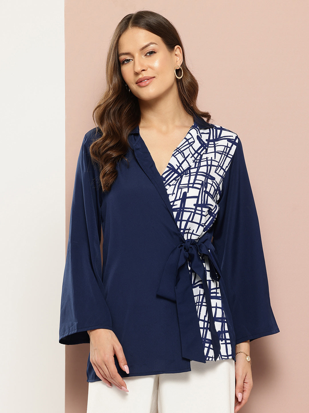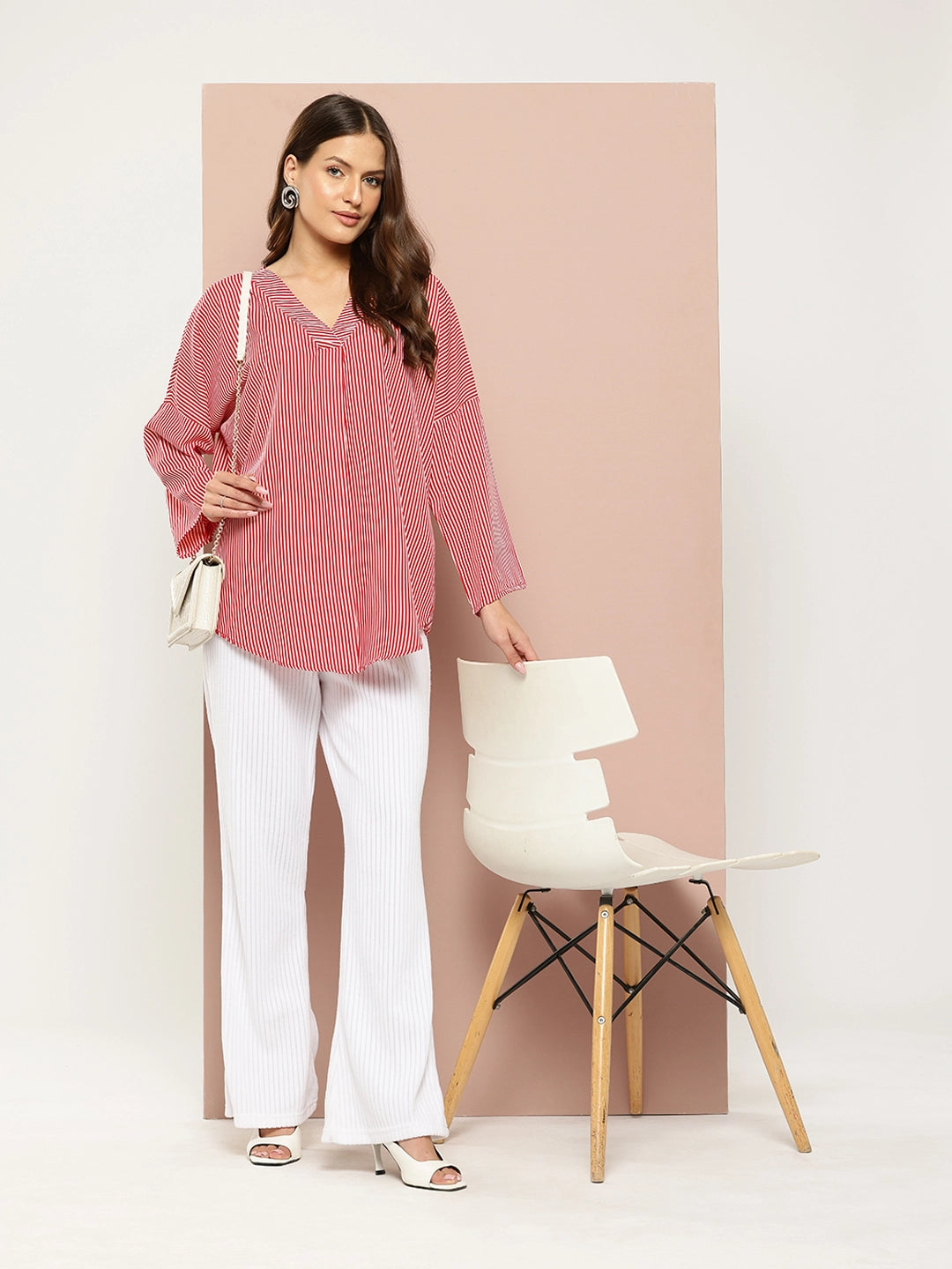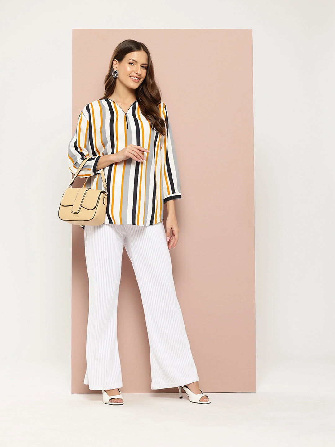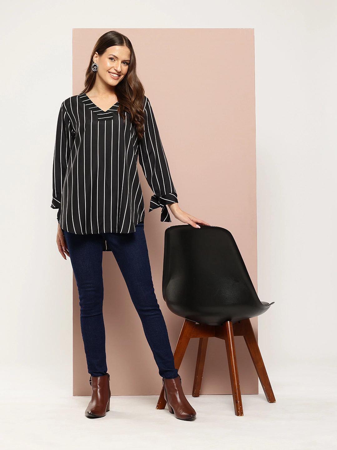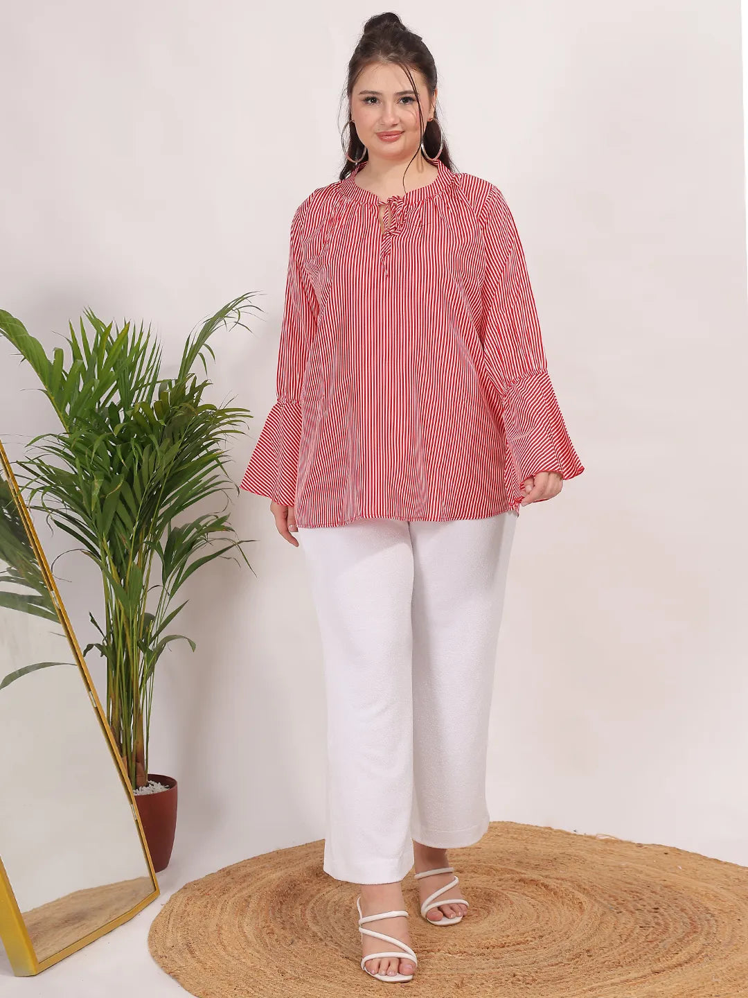 Stripes Printed Tie-Up Neck Top with Long Bell Sleeves
