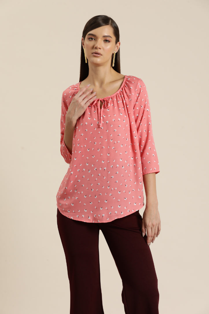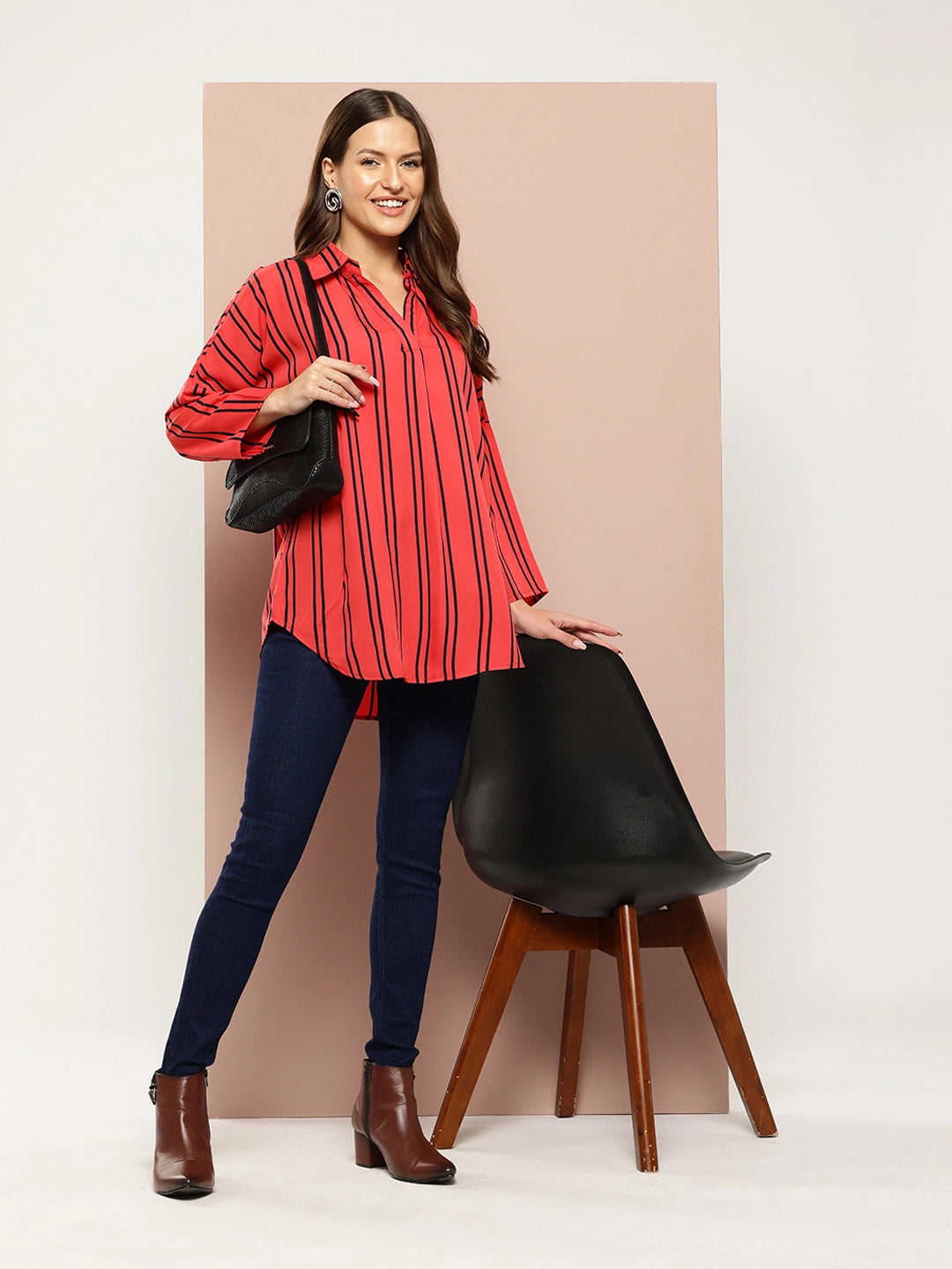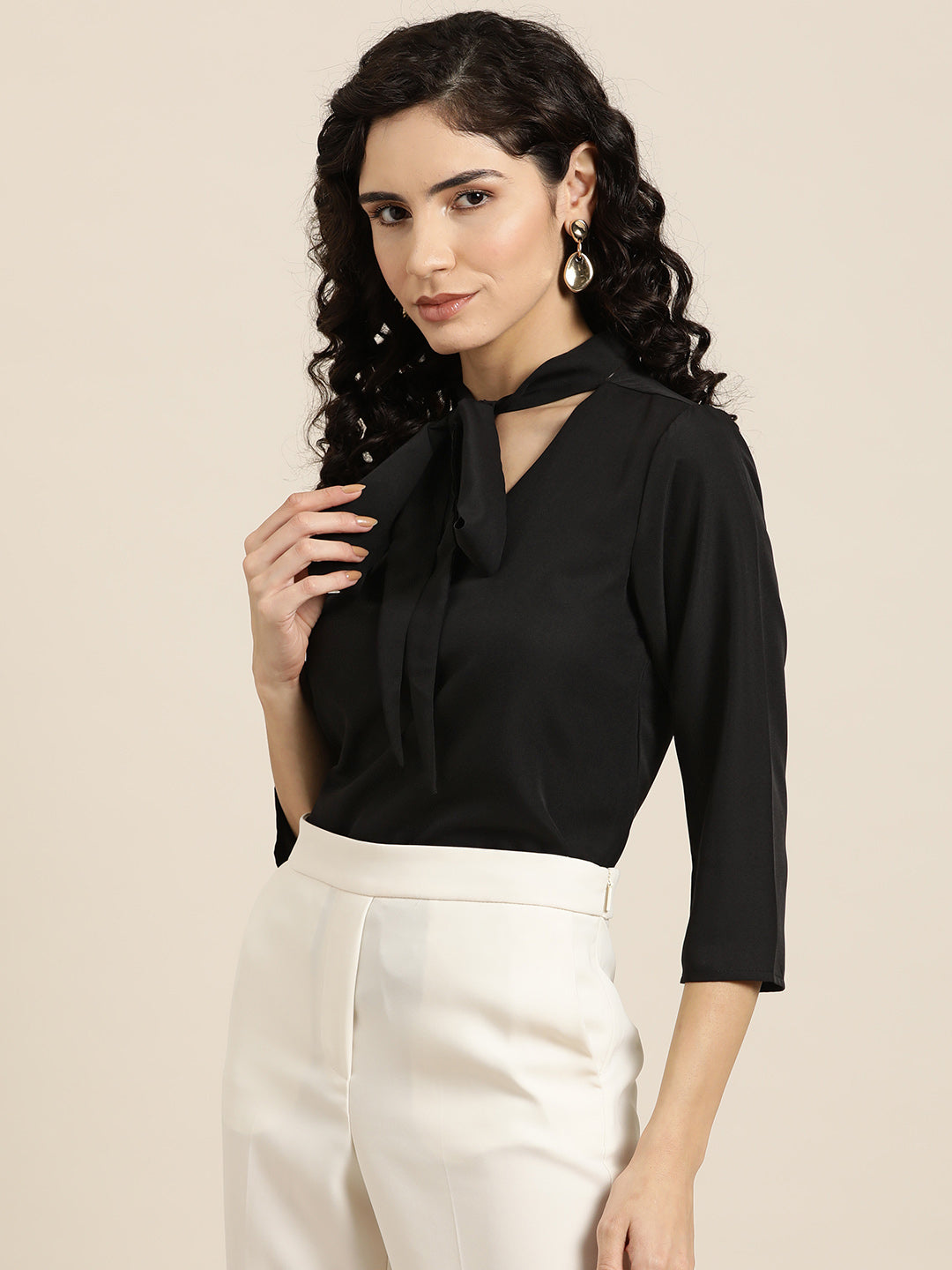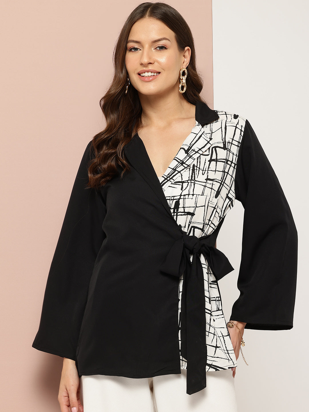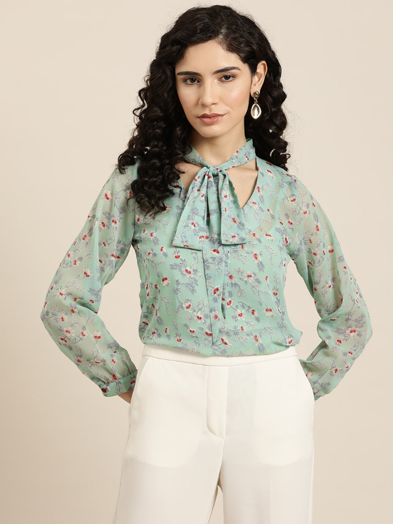 Stripes Printed Tie-Up Neck Top with Long Bell Sleeves