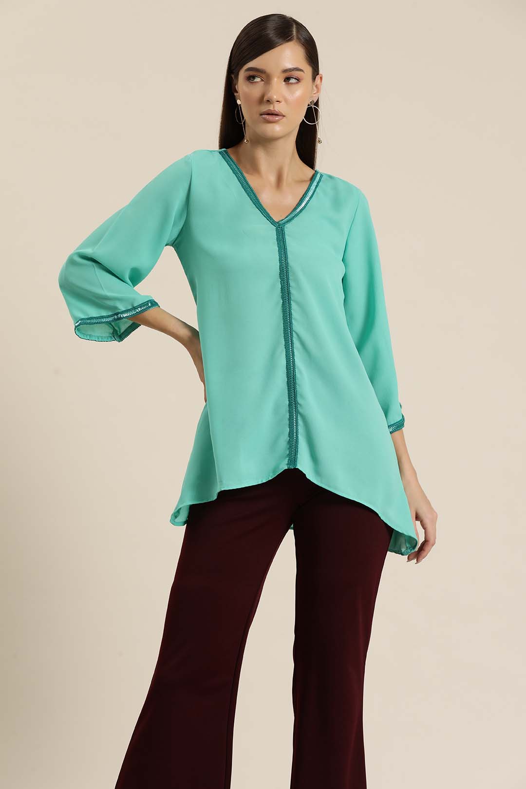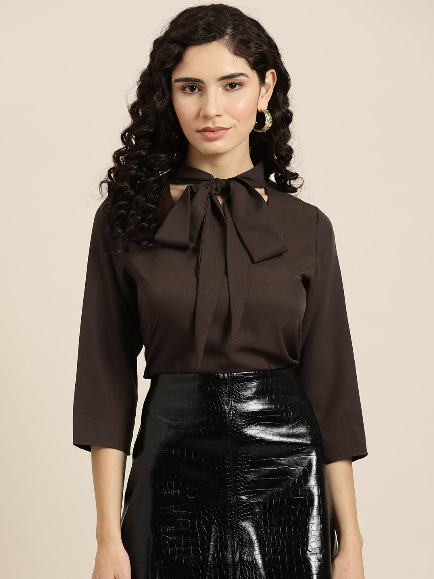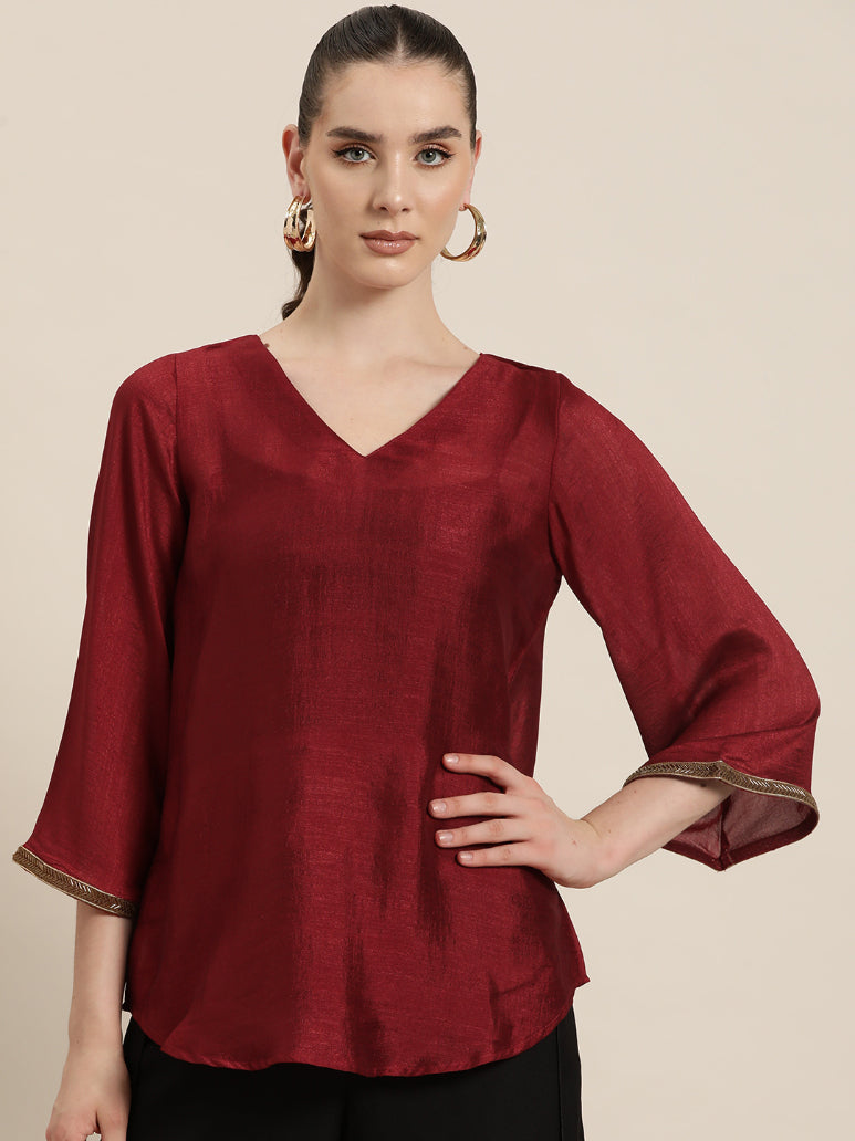 Qurvii Womens Maroon silk party top with v-neck and bell sleeves,