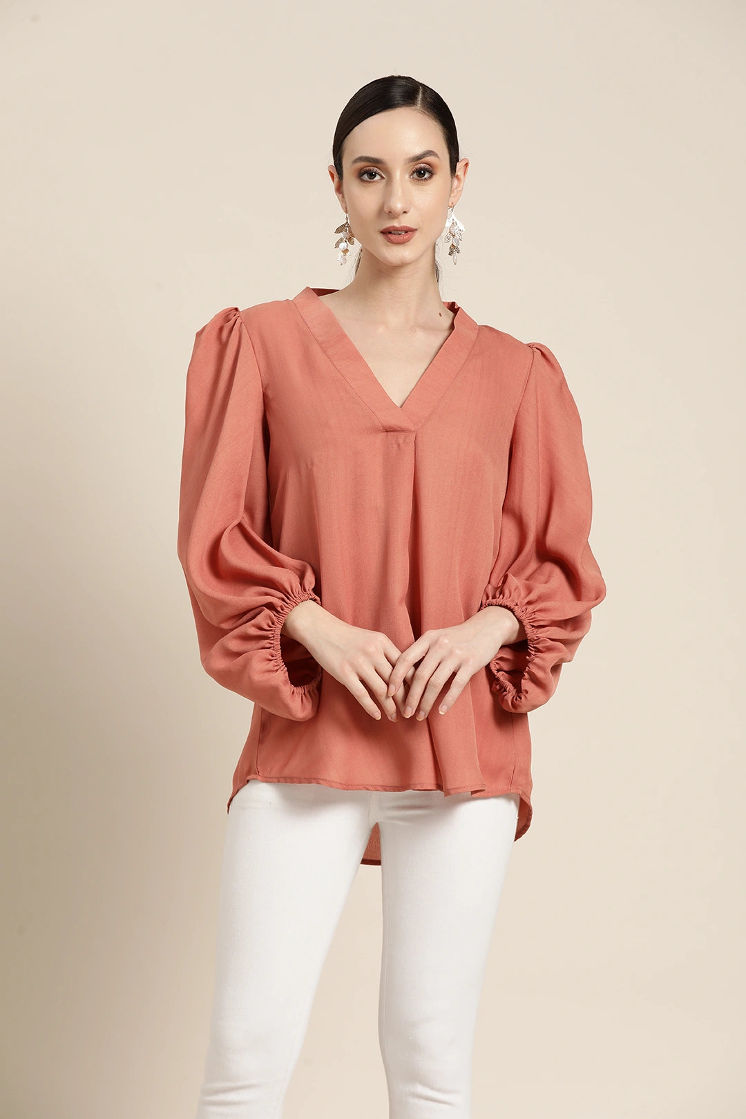 Qurvii Women's Solid peach V-neck top with high-low balloon sleeves