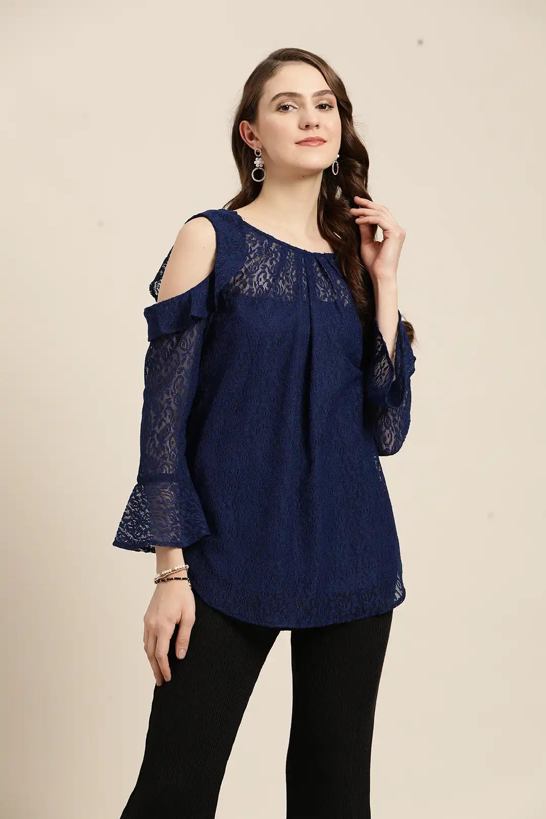 Qurvii Women Cold shoulder navy floral net tV neck top, bracelet length bell sleeves