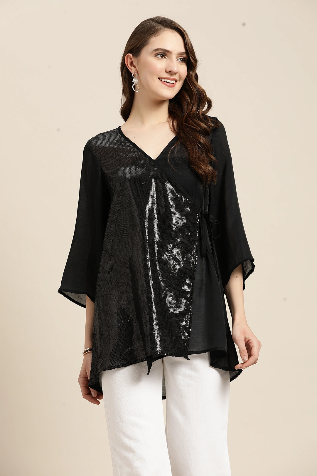Qurvii Womens black silk & sequins wrap-around top with waist tie and 3/4 length sleeves