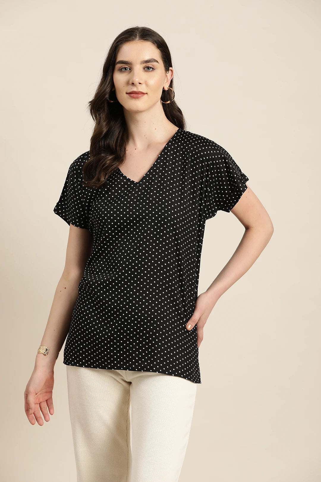 Qurvii Women black polka v-neck drop shoulder top with half sleeves