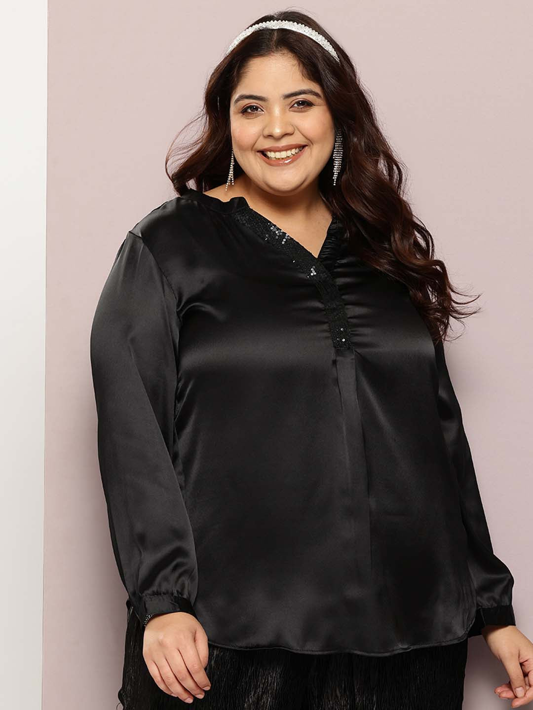 Solid Dark Black Loose Fit V Neck Full Puff Sleeve Satin Top