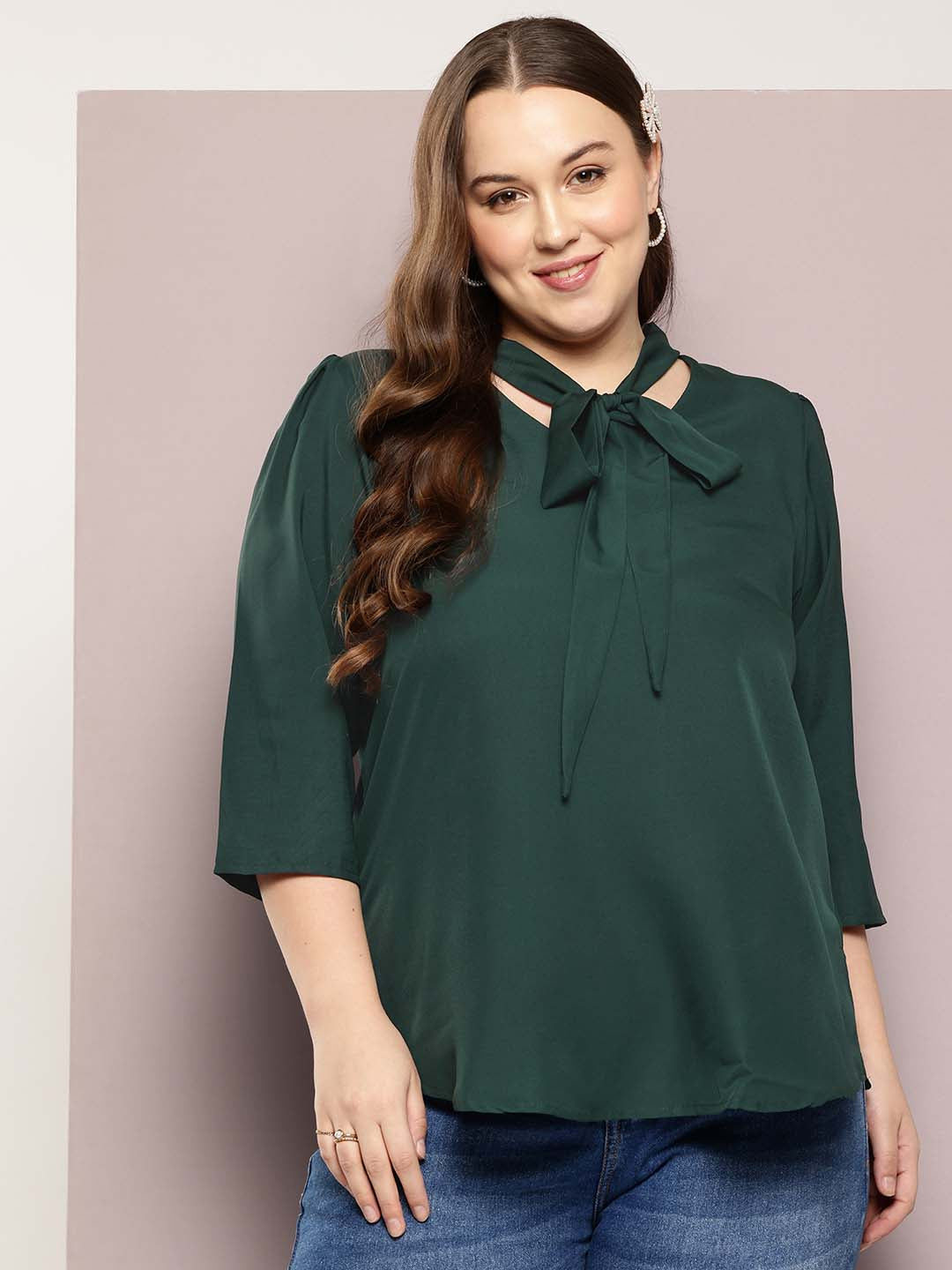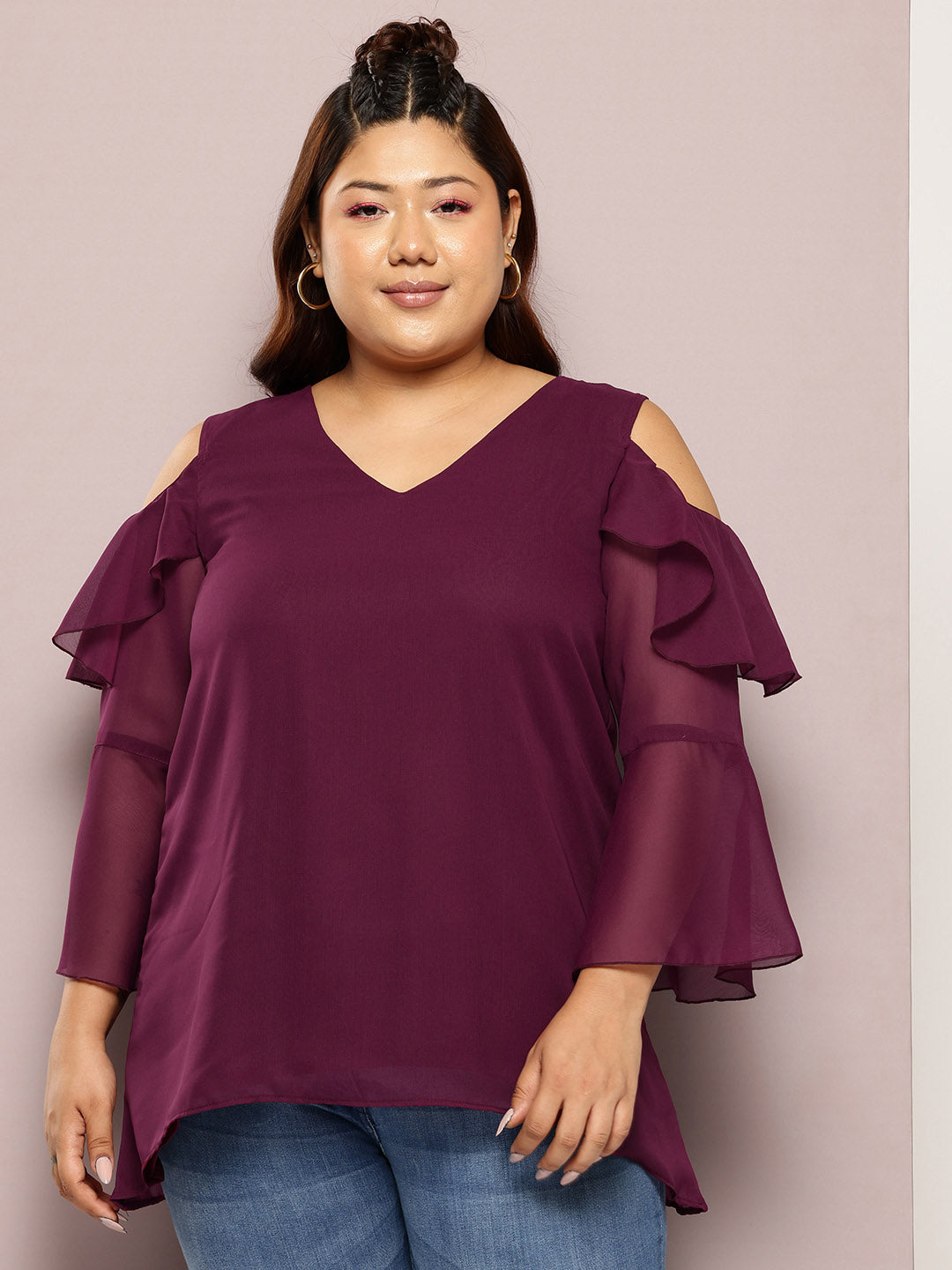 Qurvii Women Solid cold shoulder ruffle top with full sleeves and Band collar neck