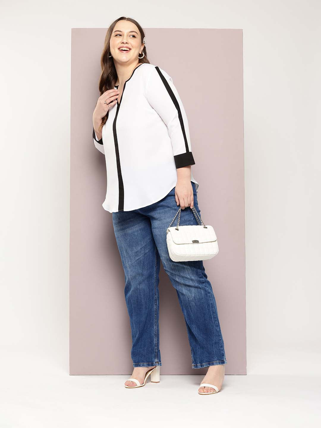 Black top with white full placket on the collar and sleeves, along white broad cuffs...