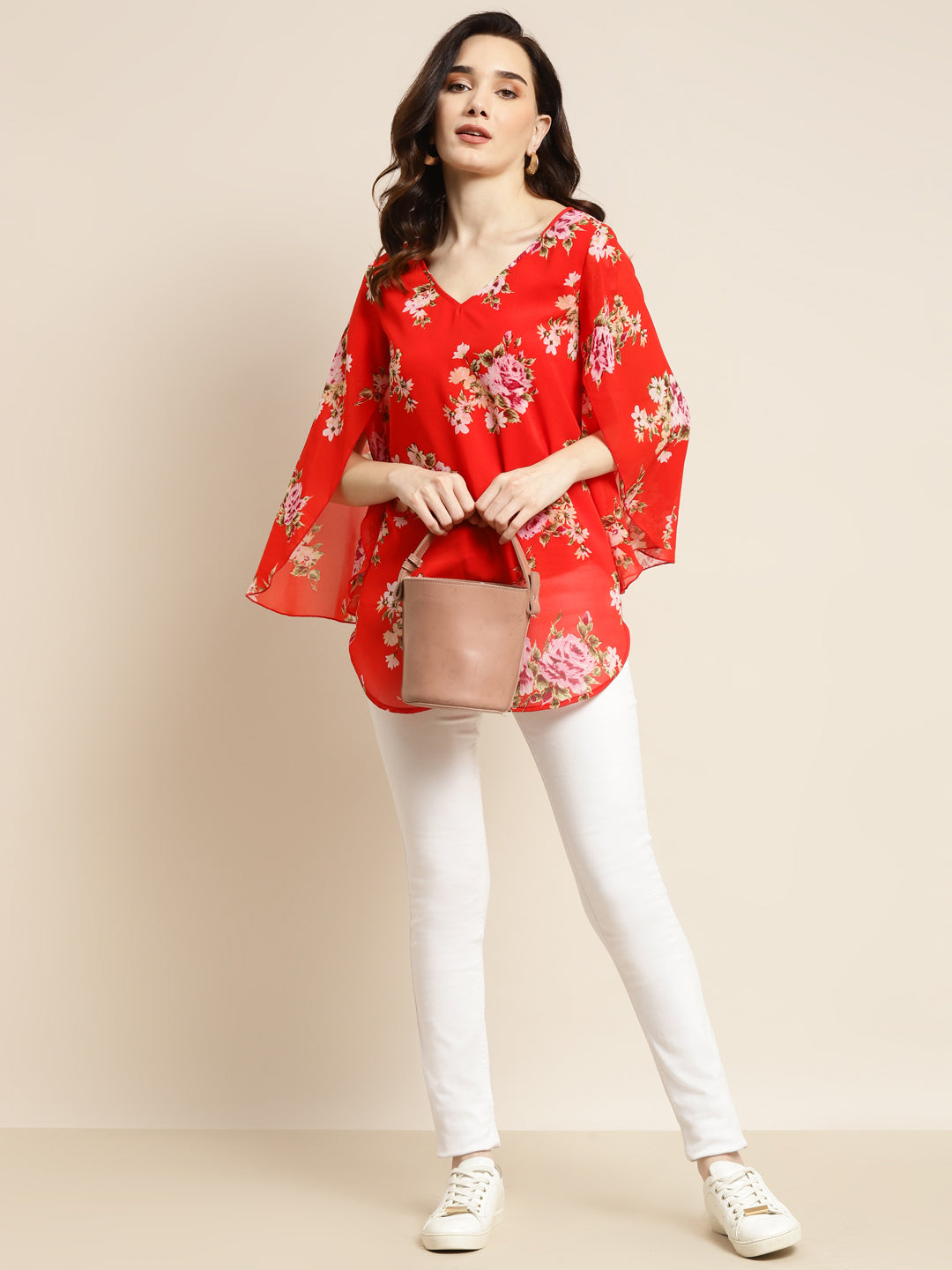 Qurvii women V neck black floral top with red piping on 3/4th bell sleeves