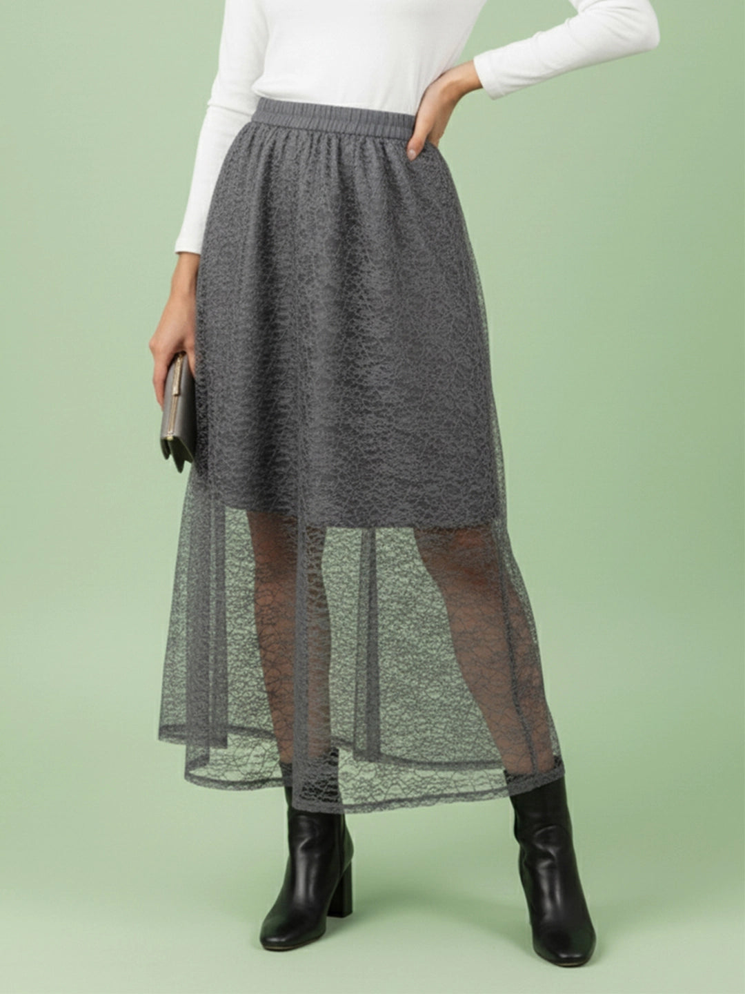 Gray Net Regular Fit Skirt with Curved Hemline and With Lining