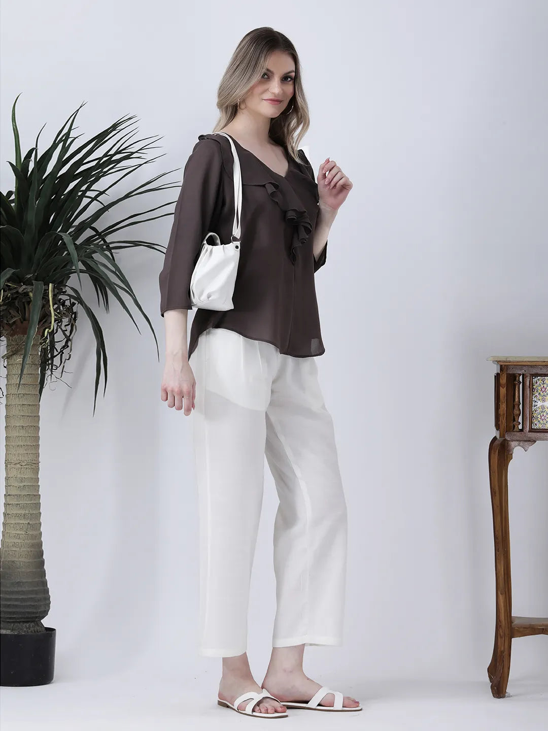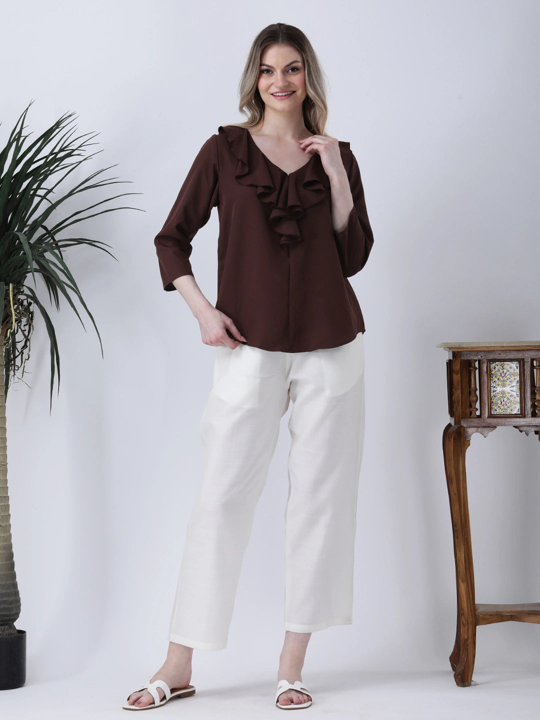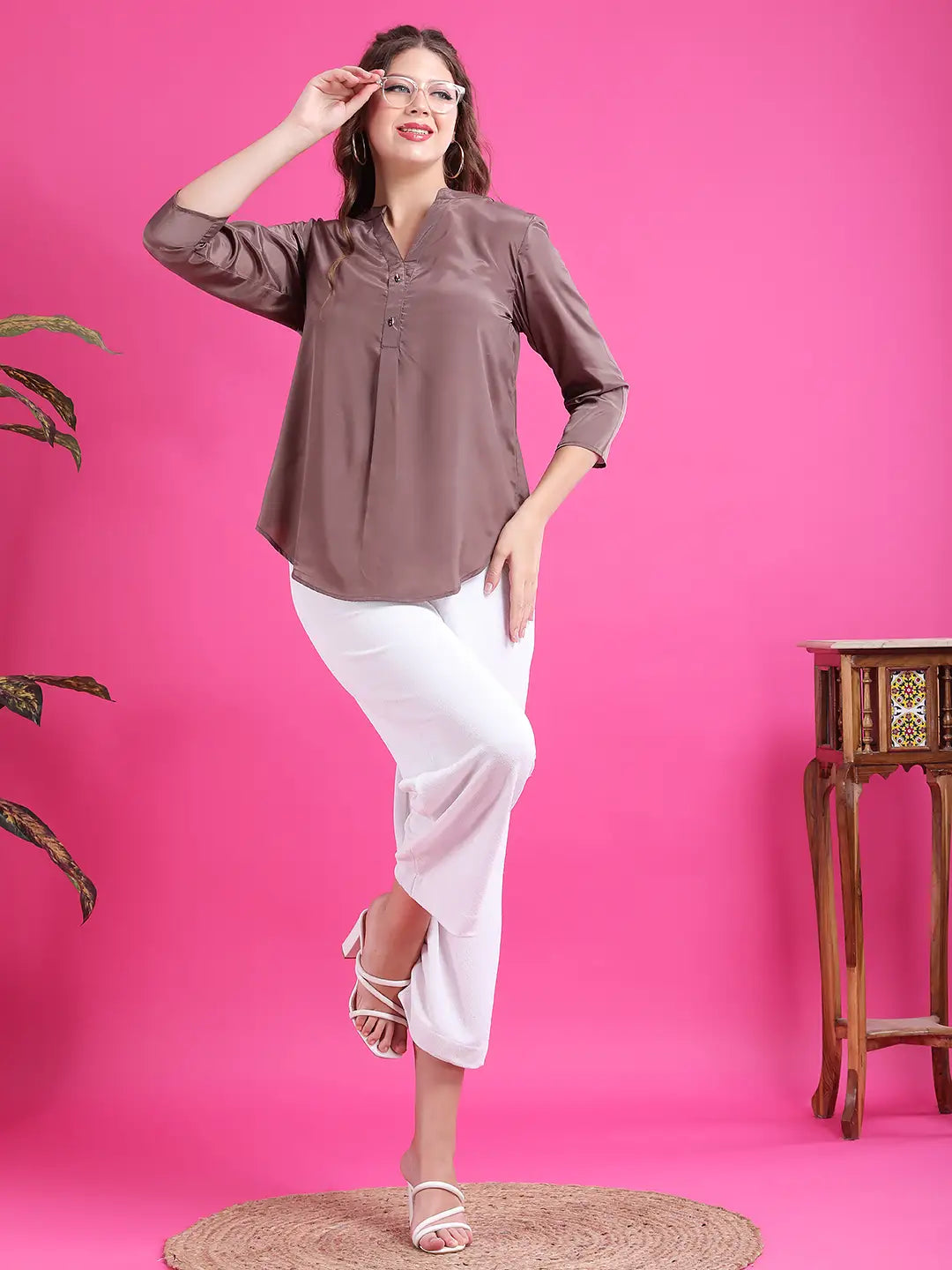 Brown Moss Crepe Regular Fit Top with Curved Hemline