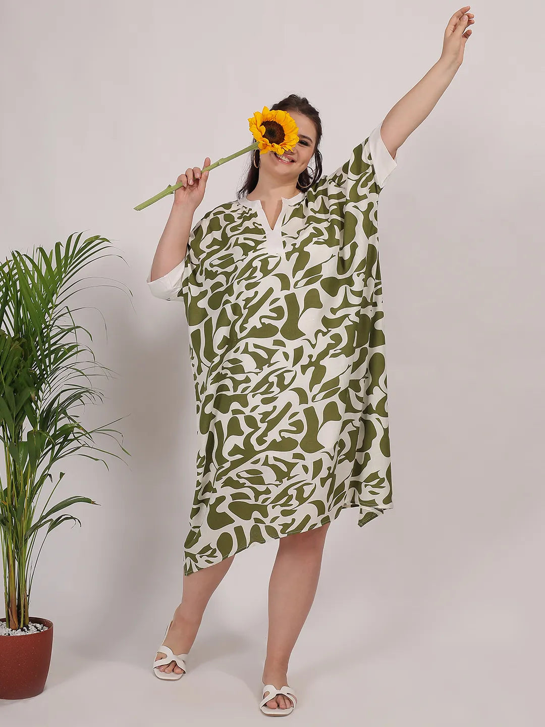 Olive Rayon Loose Fit Dress with Slit Hemline