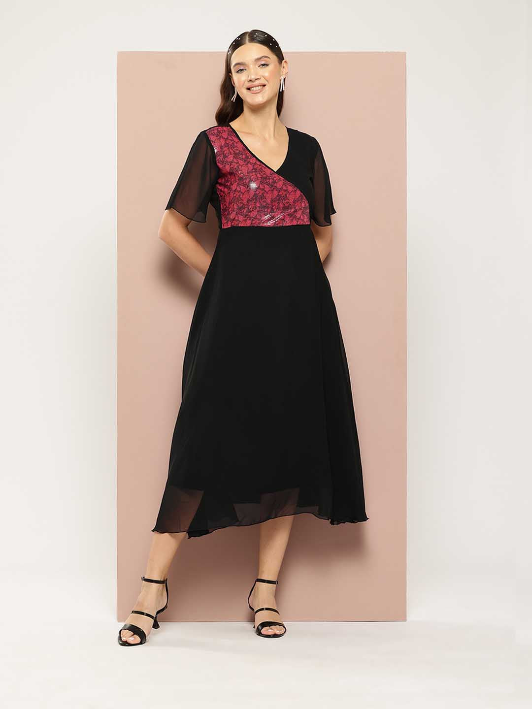 This A-line dress features a shimmering sequin v-neckline and flared net sleeves add a touch...