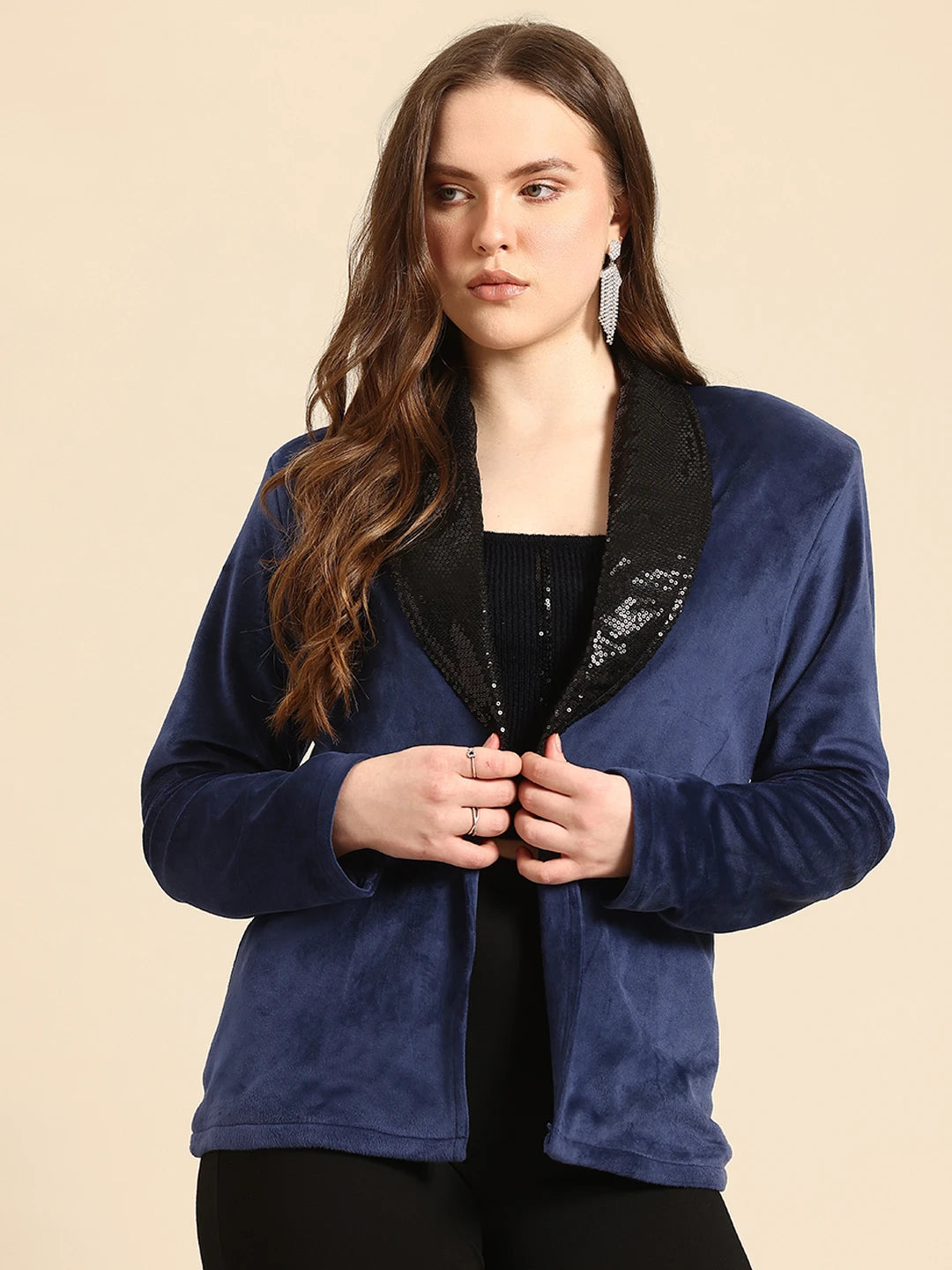 This chic color-block winter blue midi dress features full sleeves and front pockets, combining comfort...