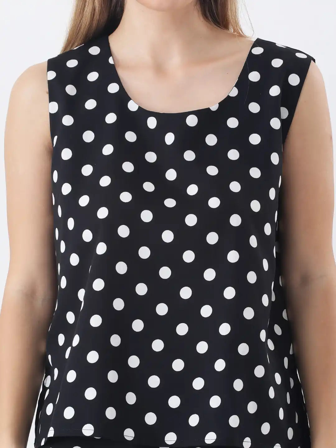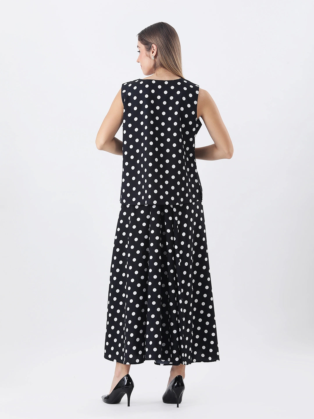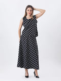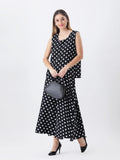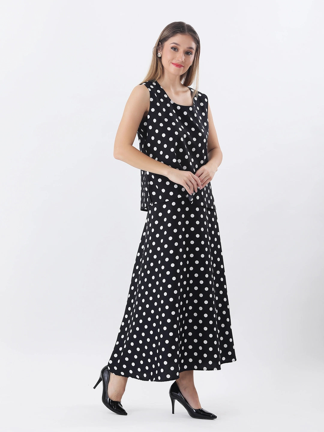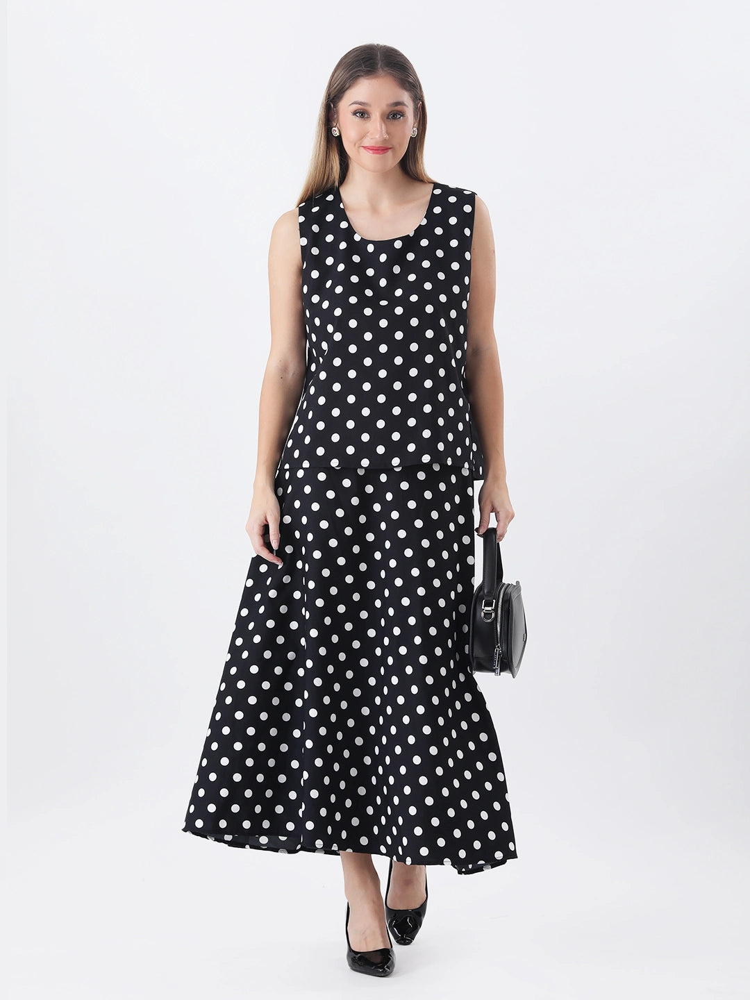 Black polka top with long a-line skirt co-ord set