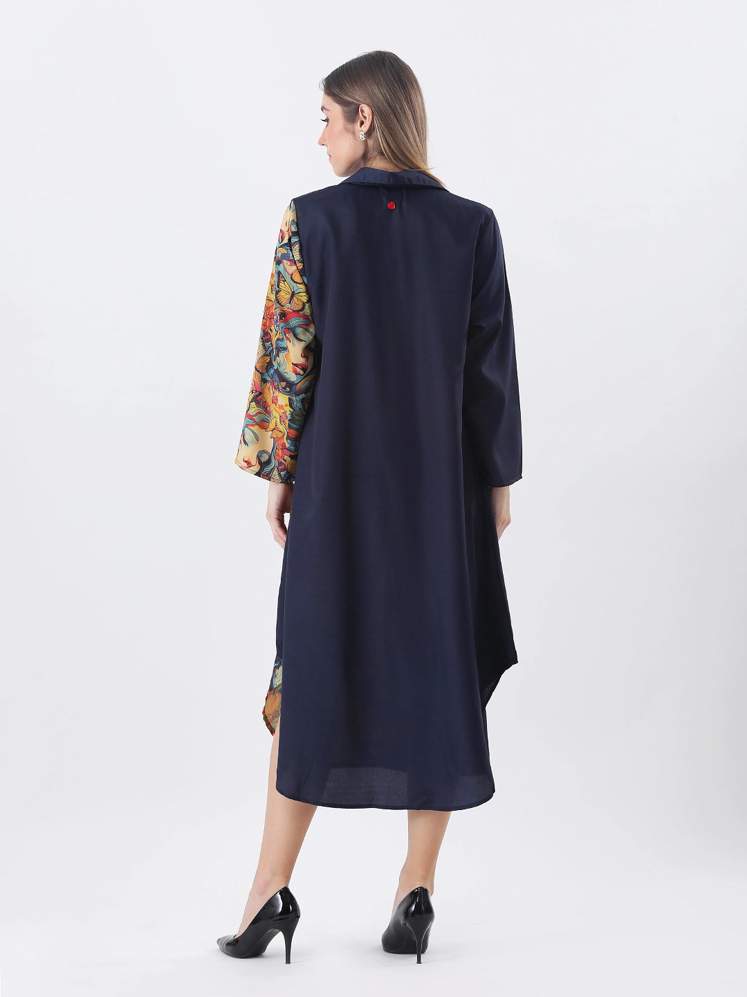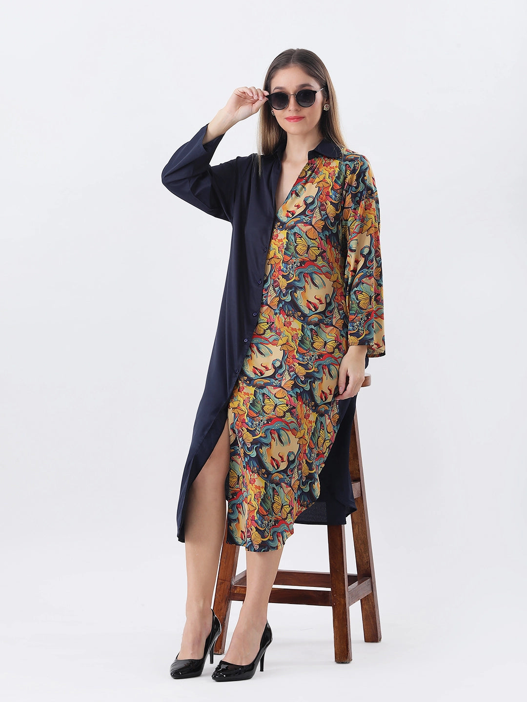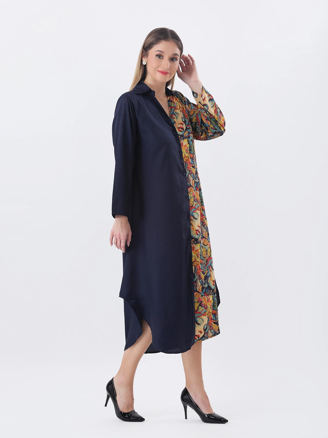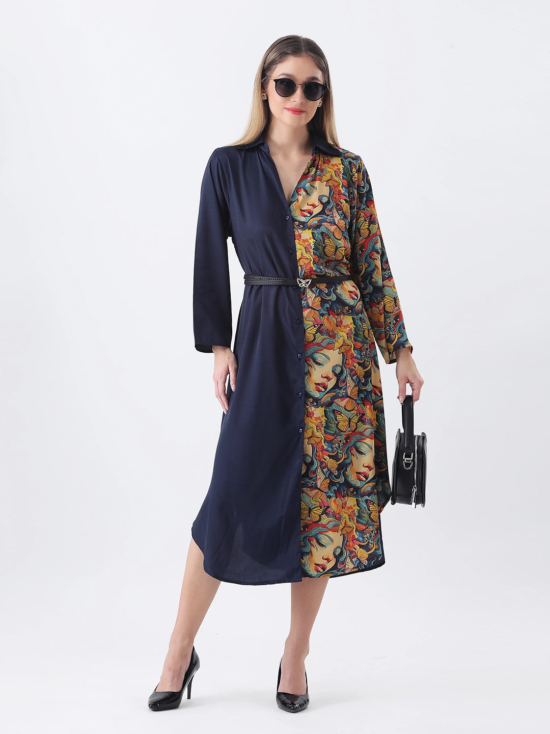 Face print color block shirt dress