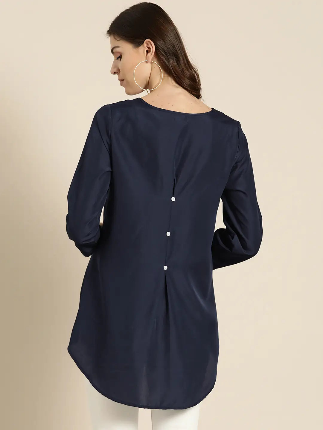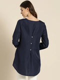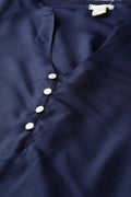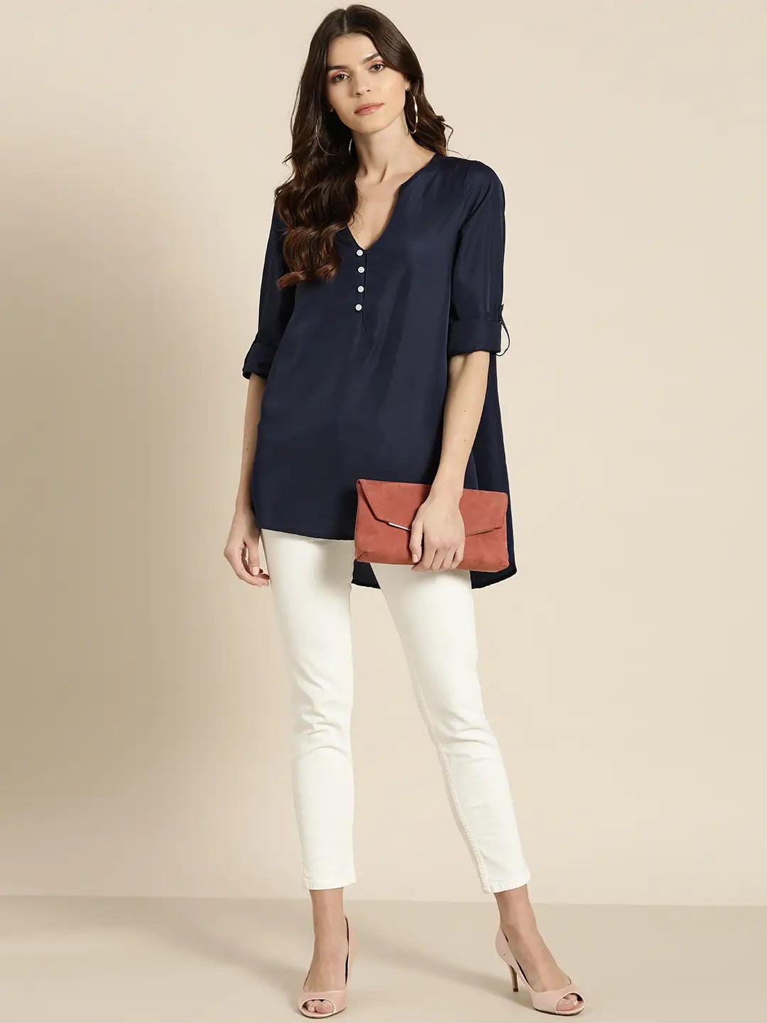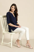 Solid Dark Navy Regular Fit V Neck Three Quarter Roll-up Sleeve Crepe Top