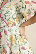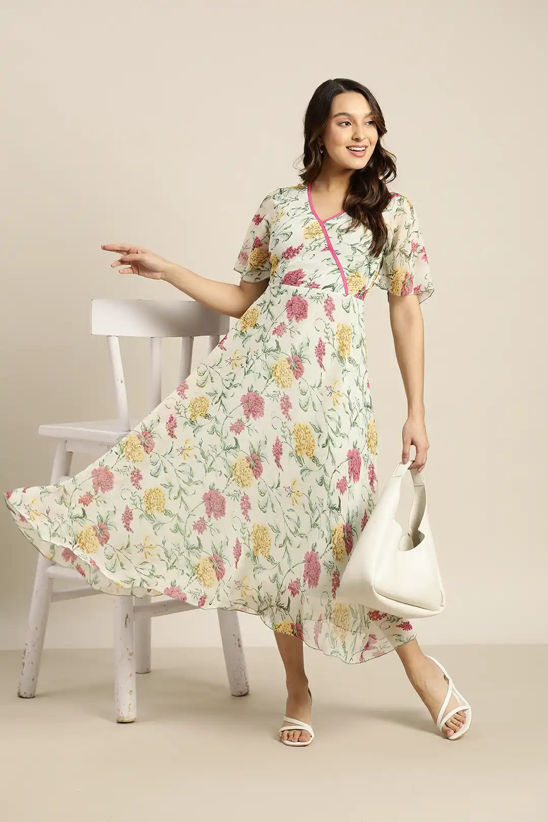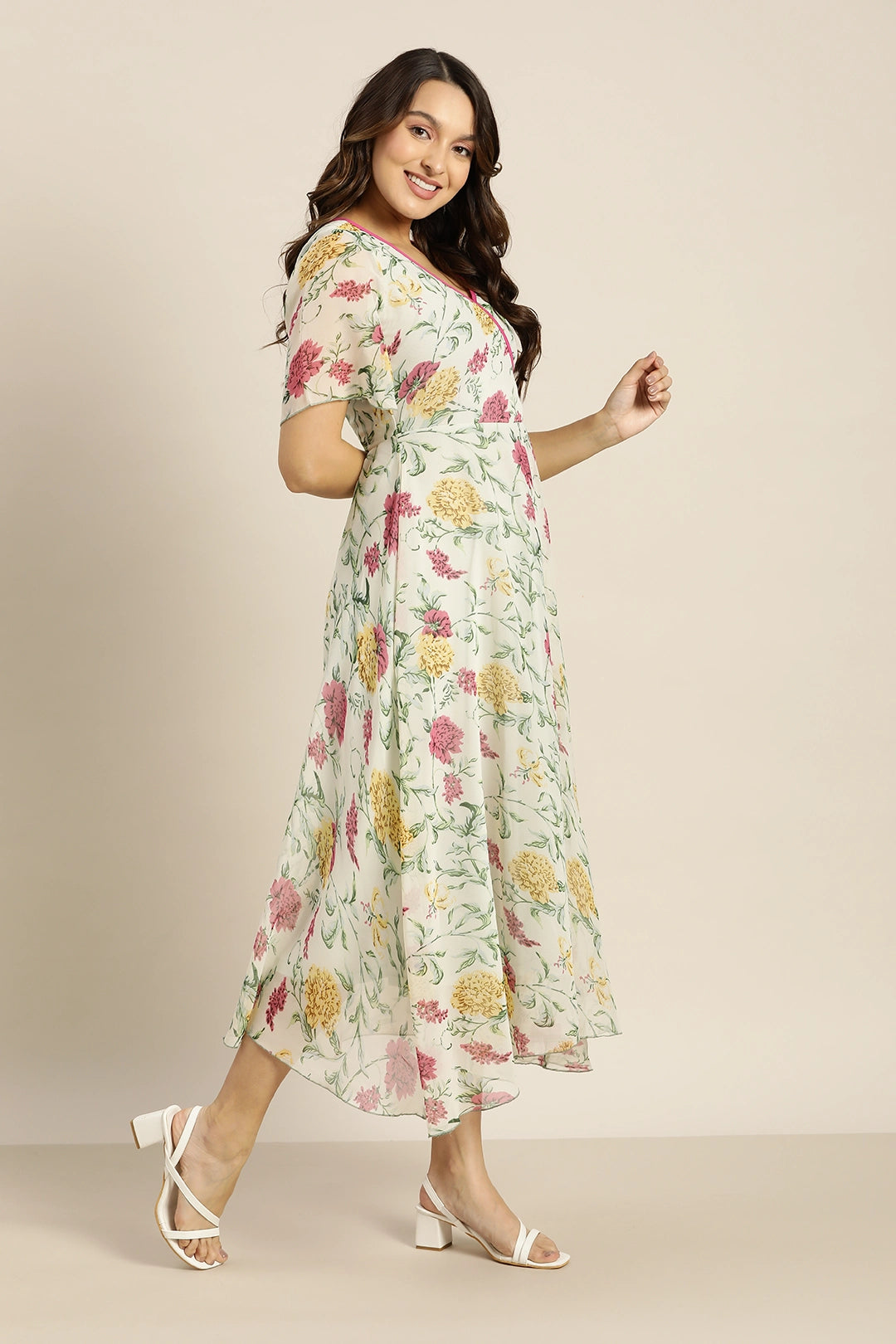 Pastels Floral Light Ivory Regular Fit V Neck Half Bell Sleeve Georgette Dress